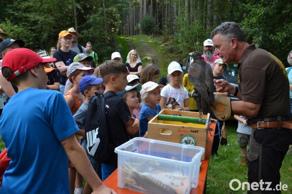 Als Gäste von den Bayerischen Staatsforsten zeigten Adele Kollmer und Wolfgang Haberstumpf den Hochsitzbau. Eine besondere Attraktion war das Fliegen der Drohne durch Florian Forster. Dabei wurde mit einer integrierten Wärmebildkamera nach Wildtieren gesucht. Tierarzt Dr. Hubert Reindl bot mit seinem Geländefahrzeug Revierfahrten an. Vom Greifvogelpark Katharinenberg holte Dr. Reindl außerdem den Falkner Eckhard Mikisch zu der Aktion. Diesem lauschten die Mädchen und Buben gebannt, denn der Falkner erzählte den Kindern alles über seine Vögel. Mit 450 km/h ist der Falke der schnellste Vogel der Welt. Schon im Alter von acht Wochen hüpft er normalerweise von Ast zu Ast und nach zehn Wochen kann er fliegen. Die Kinder waren sehr beeindruckt von den Fähigkeiten dieser Tiere.