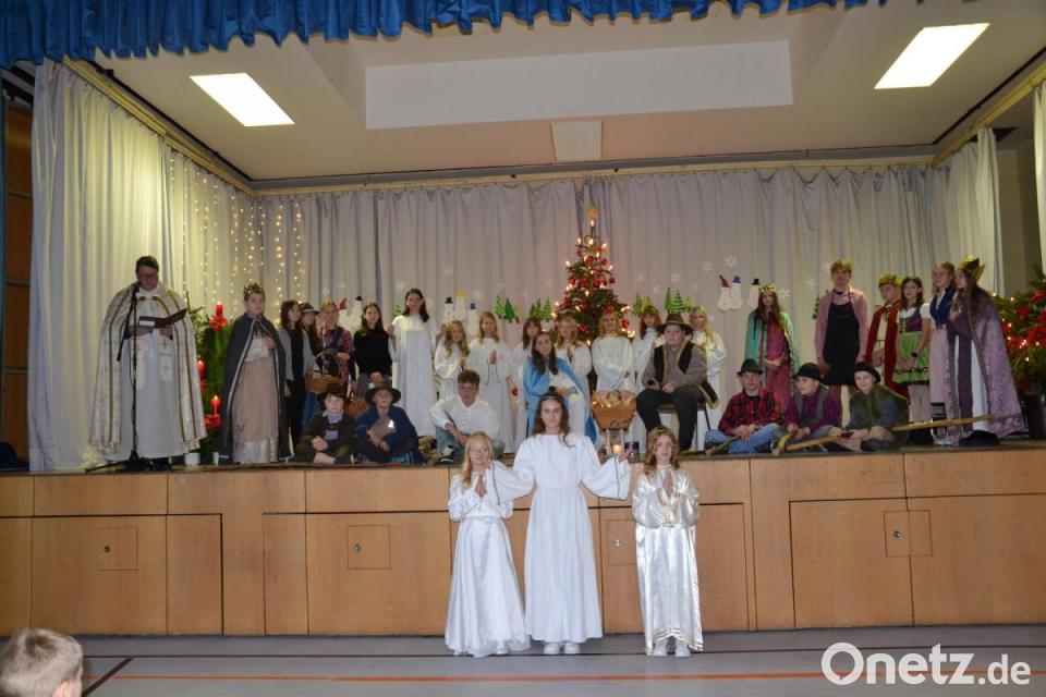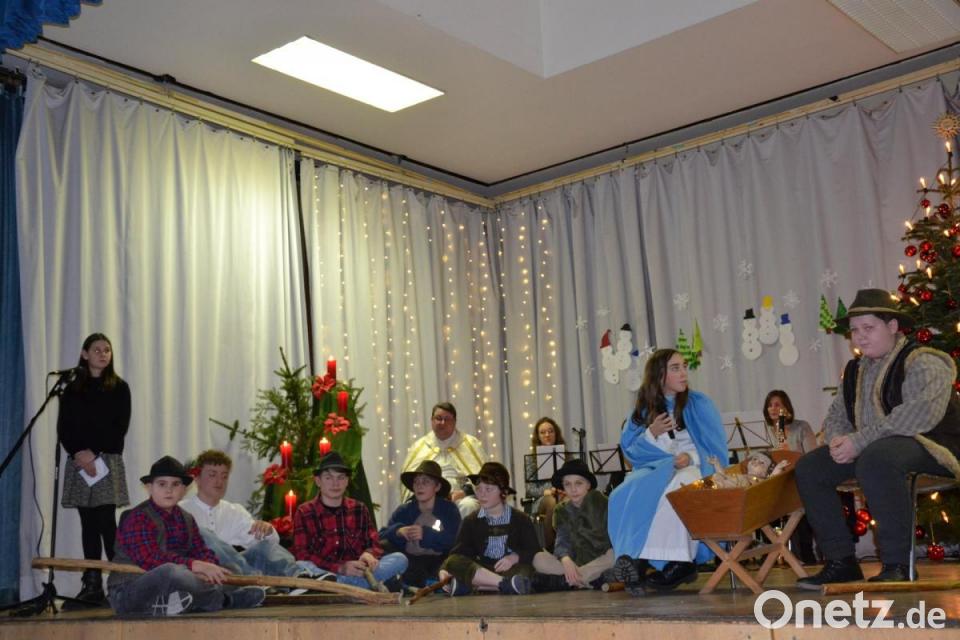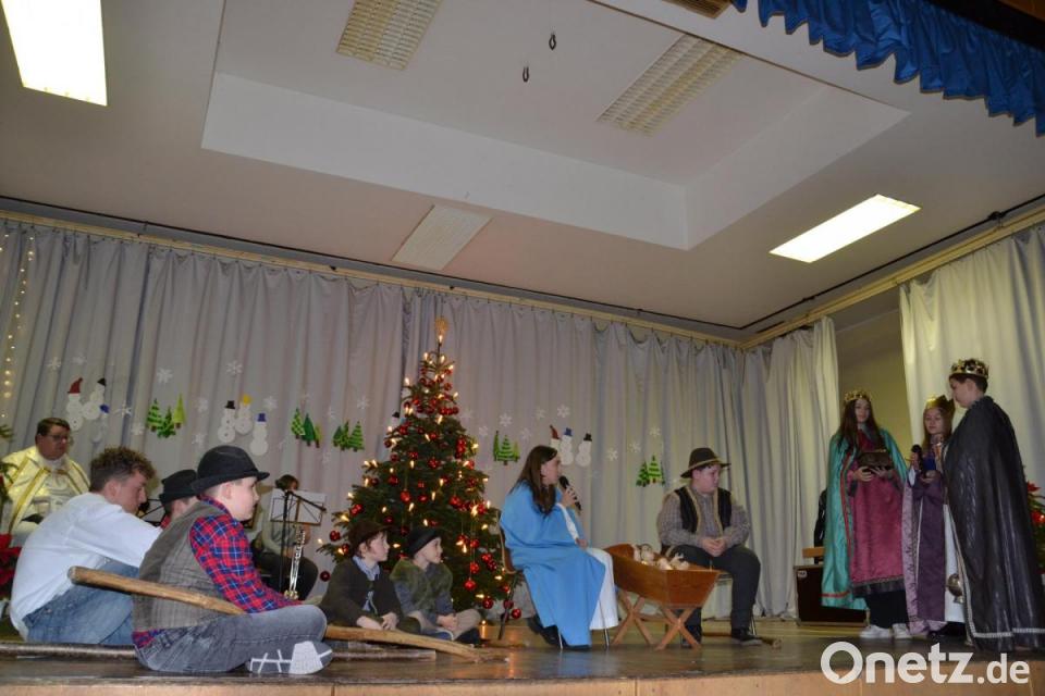 „Zum dritten und letzten Mal haben wir heuer hier in der Schulturnhalle Herberge gefunden, wie damals Maria, Josef und Jesus im Stall, weil in den Herbergen von Bethlehem kein Platz war für die werdenden Eltern, und für das Jesuskind, das in dieser Welt geboren werden wollte“, sagte Pfarrer Udo Klösel in der Christkindl-Andacht mit Krippenspiel in der proppenvollen Schulturnhalle. Das Klarinetten-Quartett begleitete die Feier. Manuel Balk aus Tröbes sorgte für die Technik. Viele Helfer und Helferinnen hatten die Turnhalle geschmückt und hergerichtet. Die Ministrantinnen und Ministranten haben unter Leitung der Oberministranten das Krippenspiel eingeübt und aufgeführt. Sprecherin war Valentina Kaiser. Das lebendige Weihnachtsgeschehen führten die Buben und Mädchen in verschiedenen Spielszenen von der Verkündigung, Erlass des Kaisers, Herbergssuche und Hirtenspiel bis zur Geburt an der Krippe auf. Auch die drei Könige hatten sich auf den Weg gemacht, um den neugeborenen König zu suchen und zu huldigen. Sie hatten Geschenke aus ihrem Land mitgebracht. Gespielt wurde Maria von Maria Schweigl und Josef von Johannes Wittmann. Am Schluss brachten drei Engel das Friedenslicht aus Bethlehem.