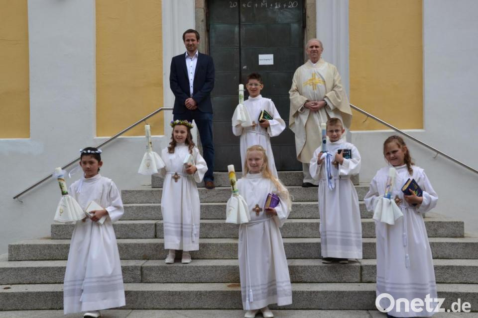 Um den Altar in Abstand erhielten aus den Händen des Priesters erhielt erstmals die heilige Kommunion: Sophia Köppl, Emma Hammerl, Maria Schweigl, Selina Seibert, Moritz Hochholzer und Jakob Meier. Zum Schluss sang Hofmeister das Segenslied.
