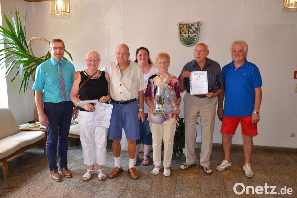 Das Besondere ist, dass beide Familien seit ihrem ersten Aufenthalt in Moosbach immer beim selben Quartiergeber einkehrten. Warum fährt man solange zum gleichen Quartiergeber fragte deshalb Ach. „Weil wir dort so zufrieden sind und es immer freundschaftlich und fast schon familiär zugeht“, verrieten sie dem Gemeindeoberhaupt. Haben Sie Probleme mit der Sprache der Einheimischen? Auch das verneinten sie. „Aber nach ein paar Bier ist die Verständigung noch besser“, verrieten sie, mit dem Oberpfälzer Dialekt ganz gut zu Recht zu kommen. Für den 40. Aufenthalt dankte das Gemeindeoberhaupt Elisabeth und Lutz Becker aus Bottrop, die in der Ferienwohnung Beugler-Bodensteiner wohnen, mit Urkunde und Gutschein. Ursula und Dieter Herrmann aus Herne, die schon 20 Mal in der Ferienwohnung „Haus Agnes“ ihr Domizil haben, dankte der Bürgermeister mit einem Sekt-Set und Urkunde. Dank sagte Ach den Gästen für ihre Treue und den Quartiergerbern für ihre Gastfreundschaft.