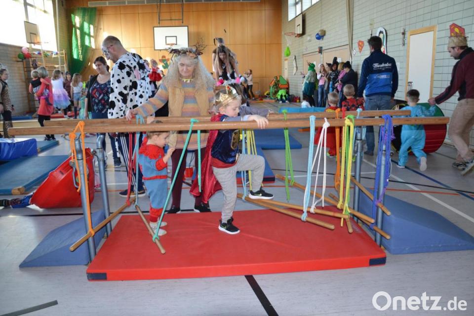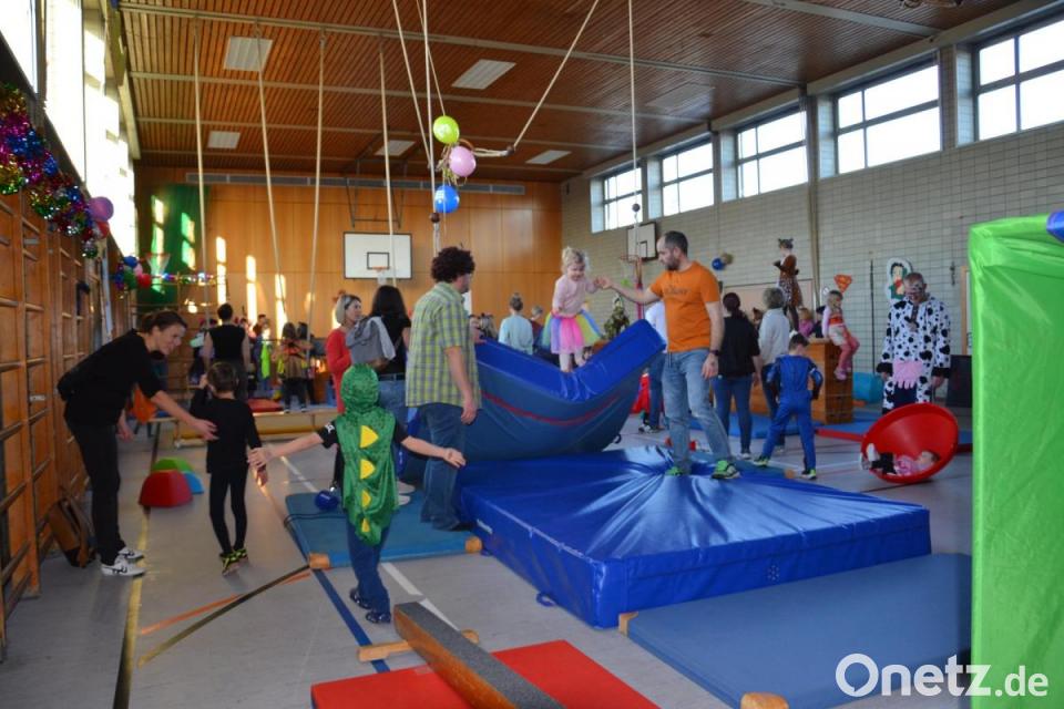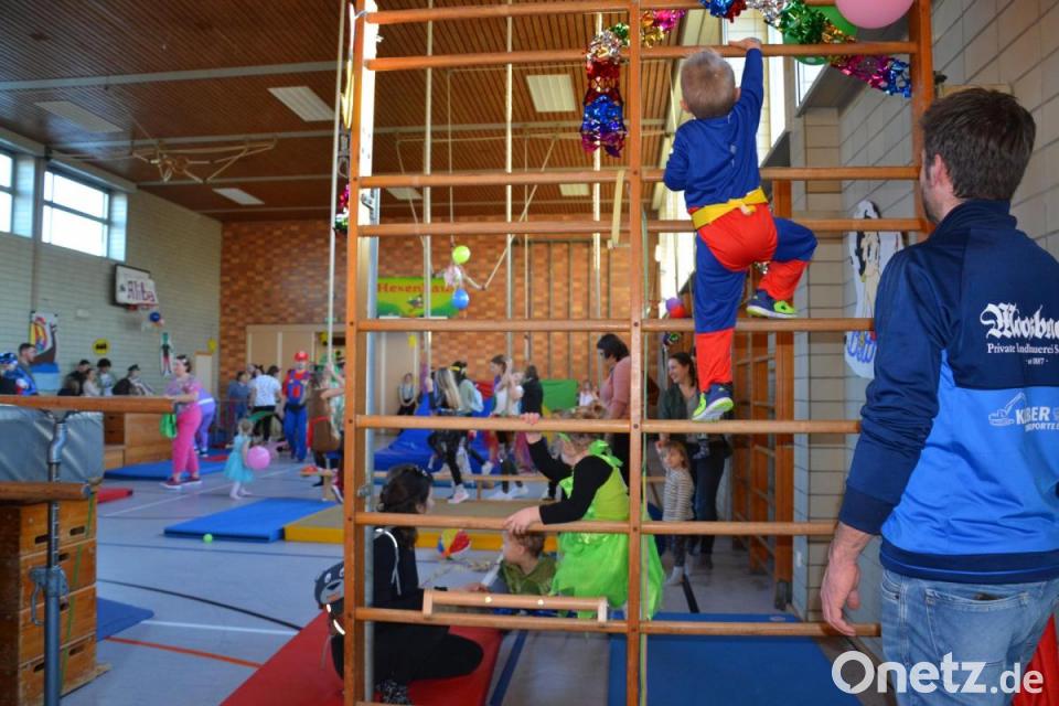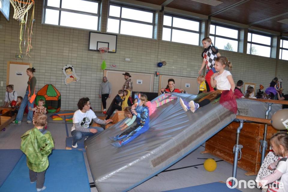 Die ganze Halle war ein riesengroßer Indoorspielplatz unter dem Motto „Fasching“. Eingeladen waren alle Kinder von zwei bis sechs Jahren mit ihren Eltern, Großeltern oder sonstigen Begleitern. Die kostümierten Kinder durften sich nach Herzenslust in der bunten Phantasiewelt austoben. Turbulent ging es an den verschiedenen Stationen zu. Mattenberge und Klettergerüste wurden mit etwas Hilfestellung der Eltern von den Jüngsten schnell erklommen. Die Kletterstationen, der Balancierbalken, Rutschen sowie Fluss-Steine, Seilklettern und Schwingschaukeln wurden gerne ausprobiert. Für die Kleinen gab es ein Hexenhaus, Bällebad und vieles mehr.