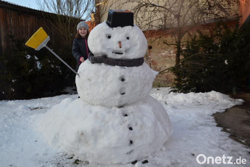 Den fast 2,50 Meter großen Schneemann hat die neunjährige Tamara mit ihren Eltern gebaut. Sie freut sich über das weiße Schmuckstück. Am Rücken hat er sogar eine kleine Rutschbahn aus Schnee. Inzwischen ist der weiße Mann die Sonne zwar auf zwei Meter geschrumft, aber die untere Kugel hat noch einen Durchmesser von 1,50 Meter und die zweite von 1,20 Meter. Lange wird es den Prachtkerl aber wohl trotzdem nicht mehr geben.
