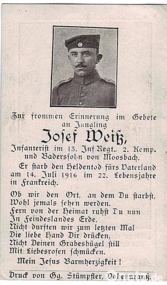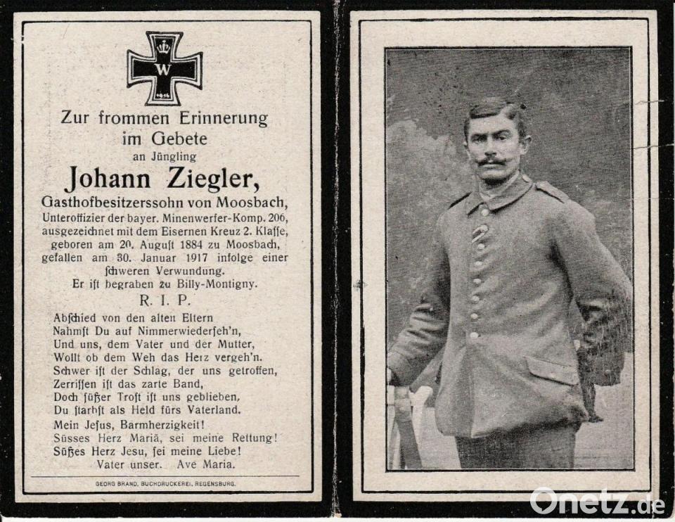 in Bewegung als Rumänien zu den Alliierten übertrat. Der Moosbacher Gefreite Adam Schweigl, der schon im Mai 1915 bei Arras an Kopf verwundet wurde, erhielt in Rumänien wieder einen Kopfschuss und starb am 31. Dezember 1916. Vorher, am 21. Oktober 1916, fiel der Student Michael Schuster aus Moosbach. Kurze Zeit später bei Arras erhielt der 32-jährige Moosbacher Gastwirtssohn Johann Ziegler in einer Minenwerfer-Abteilung eine tödliche Verwundung. „Uns, dem Vater und der Mutter, wollt ob dem Weh das Herz vergeh´n. Schwer ist der Schlag, der uns getroffen“, war auf dem Sterbebild zu lesen.