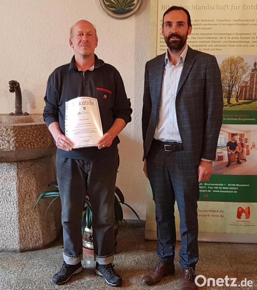 Der Feriengast Roland Watzke aus Ratingen bei Düsseldorf verbringt derzeit seinen 30. Aufenthalt in der Ferienwohnung Schwabl in Moosbach. Bürgermeister Armin Bulenda empfing den Urlaubsgast in seinem Amtszimmer im Rathaus und dankte ihm für seine jahrzehntelange Treue zu Moosbach mit Urkunde und Einkaufgutschein.