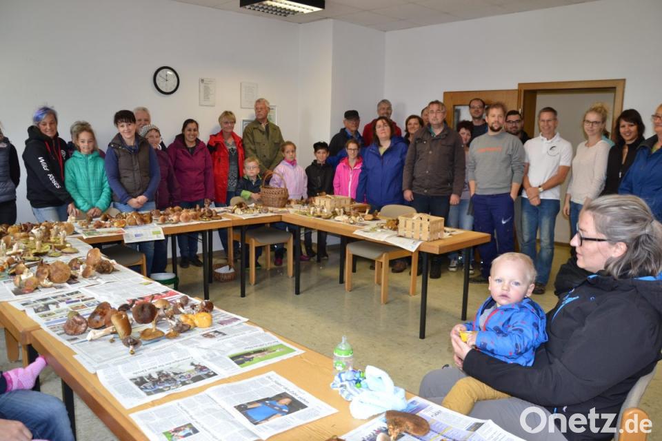 Nach dem Sammeln gab es im Rathaus in Moosbach eine Fundbesprechung. Der Sachverständige schaute in die Körbe der Teilnehmer und sortierte die Pilze nach den Gruppen essbar, ungenießbar oder giftig. Er erklärte jeden Pilz und seine Merkmale. Von den 59 gesammelten verschiedene Arten waren 26 essbar.