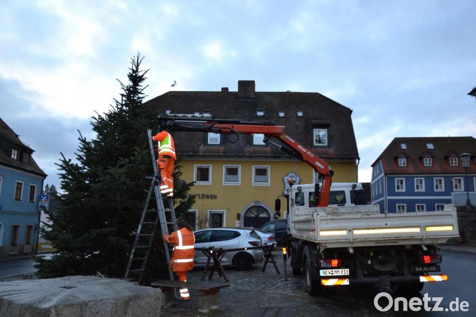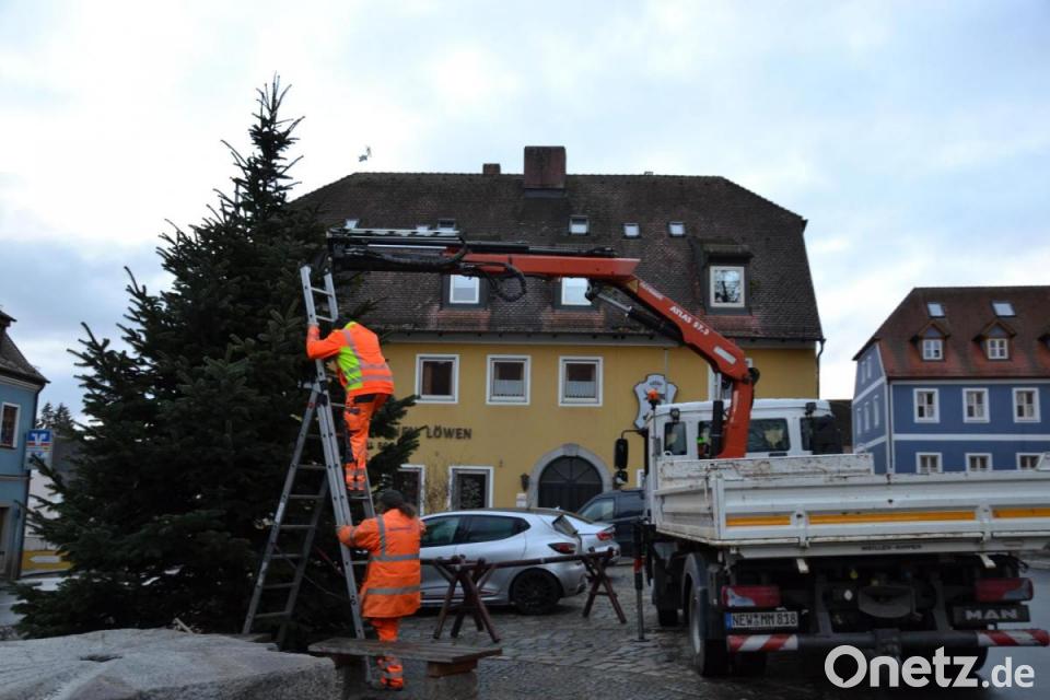 Der frisch geschnittene Weihnachtsbaum steht seit Montag am Marktplatz in Moosbach. Die Bediensteten des Bauhofs der Marktgemeinde mit Karl Koller und Christian Scherer haben den Baum vom Tannenhof Bösl aus Eslarn geholt. Mit dem Kran wurde er auf den gemeindlichen Lastwagen geladen und nach Moosbach transportiert. Die stattliche über sechs Meter hohe und die vier Meter breite Nordmanntanne wurde am Stamm noch bearbeitet und hergerichtet. Mit dem Autokran wurde der Weihnachtsbaum in dem vorbereiteten Schacht am Marktplatz in die Senkrechte gestellt und verankert. Die Beleuchtungskette mit rund 120 Lichtern für den Tannenbaum wurde heuer sicherheitshalber durch eine Hebebühne am Dienstag noch angebracht. Während der ganzen Advents- und Weihnachtszeit wird der schmucke Weihnachtsbaum strahlen. Auch der Frauenbund wird daneben die Brunnenkrippe auf den Marktbrunnen wieder aufstellen. Sie ist Anziehungspunkt für die Kinder während der Weihnachtszeit.