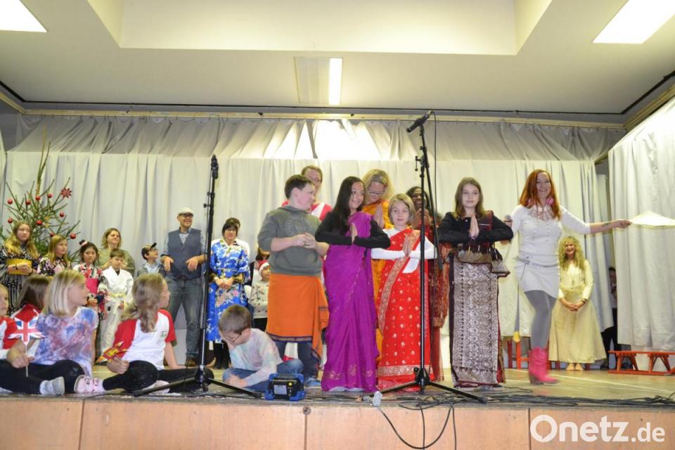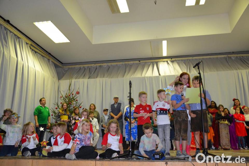 Mit dem Adventslandler des Duo's und dem Schulchor „Es schneit“ ging es weiter. Weihnachten gibt es überall auf der Welt, erfuhren die Besucher von der Mittagsbetreuung „Musketiere“ mit Vanessa Rudloff und Erika Zenk. Die erste Klasse der Mittagsbetreuung postierte sich vorn auf die Bühne. Die fünf Nationen, die in der Mittagsbetreuung vertreten sind, wünschten „Frohe Weihnachten“ in ihrer Landessprache. Dazu informierte Rudloff wie der Heilige Abend in dem jeweiligen Land gefeiert wird und von wem die Kinder Geschenke bekommen. Die beiden Betreuerinnen freuten sich, dass auch Eltern auf der Bühne mitmachten. Das erste Land war England, gefolgt von Japan, Amerika, Sri Lanka und der Slowakei.