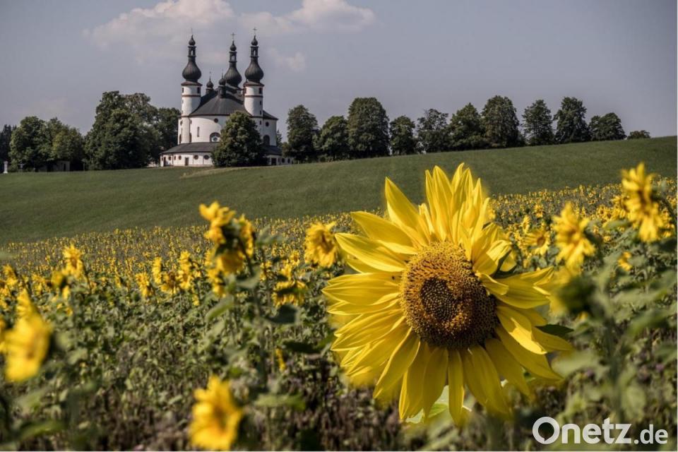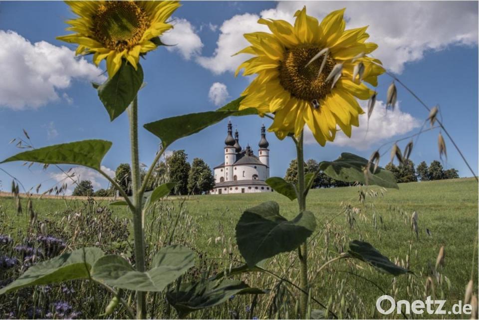 Die kräftigen Farben und der imposante Barock-Rundbau sind zusammen ein echter Hingucker. Weitere Blühflächen hat Landwirt Hecht beim Wasserbassin oberhalb des Dorfs angesät, ganz in der Nähe des Fernseh-Umsetzers.