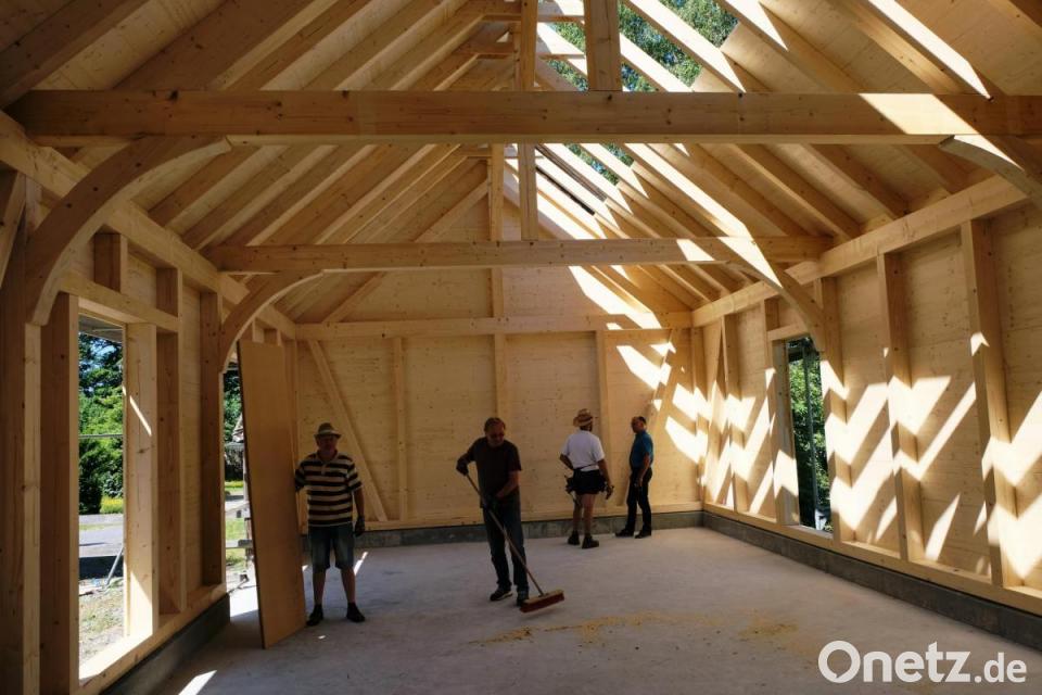 Doch die Münchsreuther und die Hirthausfreunde um Vorsitzenden Albert Schmid leisten die Hauptarbeit für das „Grobe“. In den vergangenen Tagen unterstützte ein Hirthaus-Team die Zimmererarbeiten der Firma Wiesnet aus Ernstfeld zum Aufbau der Holzkonstruktion. „Für Münchsreuth ist es ein Schlüsselprojekt“, sagt Bürgermeister Albert Nickl. Gestärkt werde mit den vielen Eigenleistungen der Dorfbewohner der Zusammenhalt in der Ortschaft. Der Bürgermeister verwies auf geschätzte Baukosten in Höhe von 75.000 Euro. Ein Teil der Kosten werde durch Eigenleistungen gedeckt, so Albert Nickl. Insgesamt schätzt Organisationsleiter Albert Schmid das Engagement auf zirka 1000 Arbeitsstunden für Gottes Lohn. Ein Glücksfall für die Münchsreuther und die Gemeinde sei die Bezuschussung dieser Arbeitsleistungen durch das Amt für Ländliche Entwicklung. Der Fördersatz aus Dorferneuerungsmitteln beträgt 66 Prozent. Mit einer Fertigstellung rechnen die Münchsreuther und der Bürgermeister bis zum Spätherbst. Dann finden auch die Hobby-Künstler für ihren beliebten Kunsthandwerkermarkt ideale Räume vor.