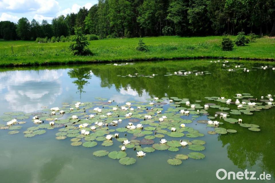 Der Eigentümer dieses Teiches nahe der Creußen ist ein Naturliebhaber. Er besitzt ein kleines Paradies, in dem ein Seerosen-Ensemble gratis blüht und die Landschaft in einen Ort der Ruhe und Erholung verwandelt.