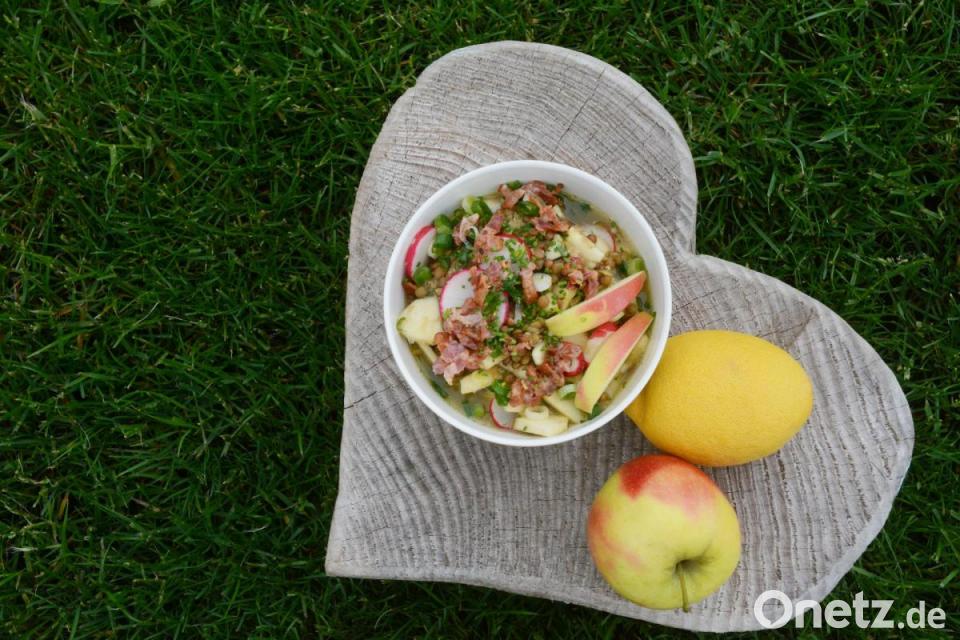Essig, Salz, Pfeffer und Öl zu einer Vinaigrette rühren. Die abgetropften Linsen, die Radieschen, Frühlingszwiebel, Sprossen und Äpfel darin wenden und 15 Minuten ziehen lassen.