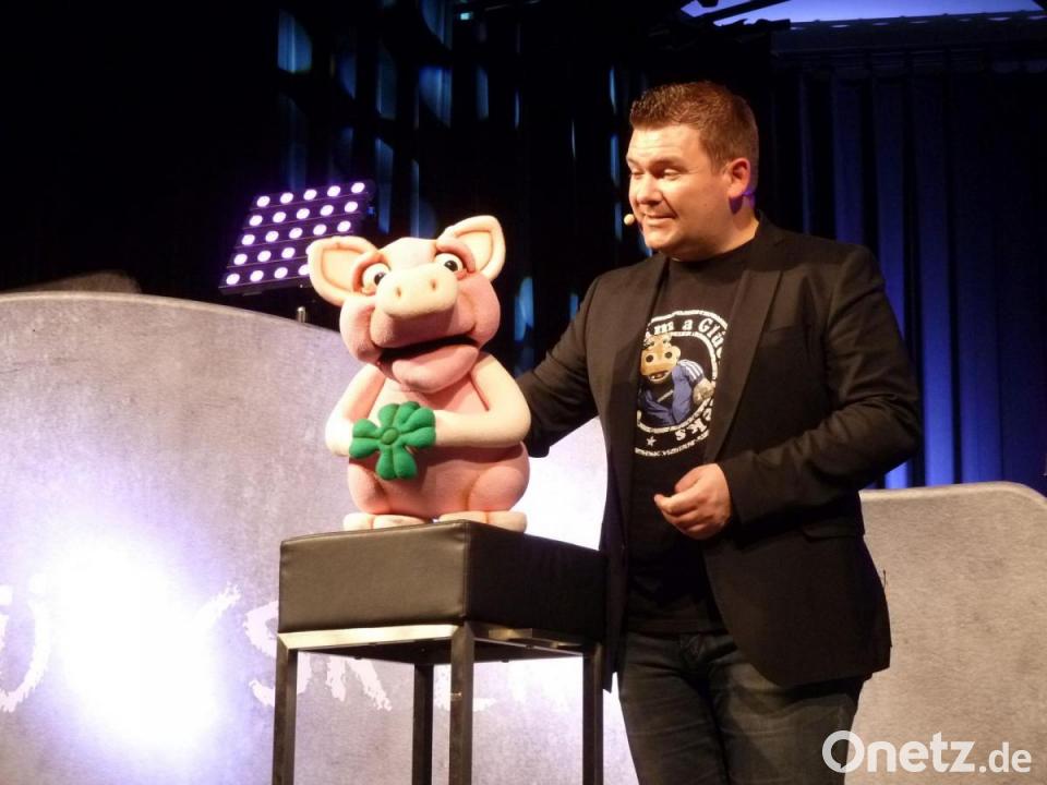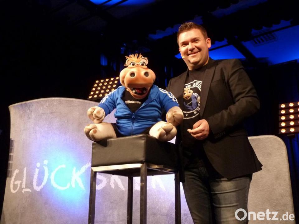 Vor Beginn und in der Pause haben die Besucher die Möglichkeit, auf Karten - entsprechend dem Motto - zu erklären, was Glück für sie bedeutet. Einzelne Antworten werden vom Bauchredner dann vorgelesen, und mit Amandas spontanen Kommentaren ziehen die beiden Spaßmacher die Lacher auf ihre Seite. "Ich schmeiß mich weg", lacht Amanda über den auf einer Glückskarte stehenden Wohnort Stulln. Ich esse eine "Stulln", feixt die Dame und fragt sich, an welchem Ende der Welt dieser Ort wohl liegt. Amanda wäre glücklich, laut ihrer eigenen Karte, wenn sie ein Handy hätte. "Mit einem Handy wirst du doch nicht glücklich", kontert ihr Herrchen. Worauf die Nilpferd-Dame meint: "Doch, wenn du es bezahlst". Die Zeit, in der es wie in der Kindheit von Sebastian Reich noch keine Handys gab und man Schnick-Schnack-Schnuck oder Sackhüpfen spielte, bezeichnet das Plüsch-Tier ohnehin als Steinzeit.