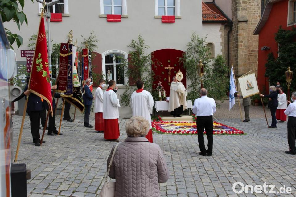 Zum Festgottesdienst konnte Pfarrer Lorenz den neugewählten Bürgermeister Frank Zeitler und Mitglieder des Stadtrates sowie die Fahnen der katholischen Vereine, der Ortsfeuerwehren und einiger weltlicher Vereine begrüßen. Die festliche Eucharistiefeier wurde mit Schola-Gesang unter Leitung von Chorregent Jonathan an der Orgel umrahmt. Beim eucharistischen Gebet vor der Bücherei am Oberen Markt - dort, wo sonst die traditionelle Fronleichnamsprozession endet - war der Blumenteppich mit dem Motiv des Seesturms Blickfang. Fleißige Hände des Frauenbundes ließen den Teppich in mehrtägiger Arbeit entstehen.