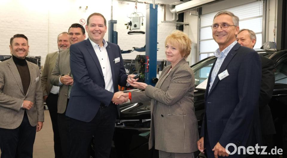 Die Schule hat schon mehrmals Fahrzeuge von BMW bekommen, aber noch nie ein so teures. Der 326 PS starke iX Drive 40 kostet 91 000 Euro. „Wir können damit unseren Kfz-Mechatronikern im Unterricht modernste Technologie anbieten“, freute sich stellvertretende Schulleiterin Rosina Pimmer bei der Übergabe am Dienstag in der Werkstätte der Nabburger Außenstelle.