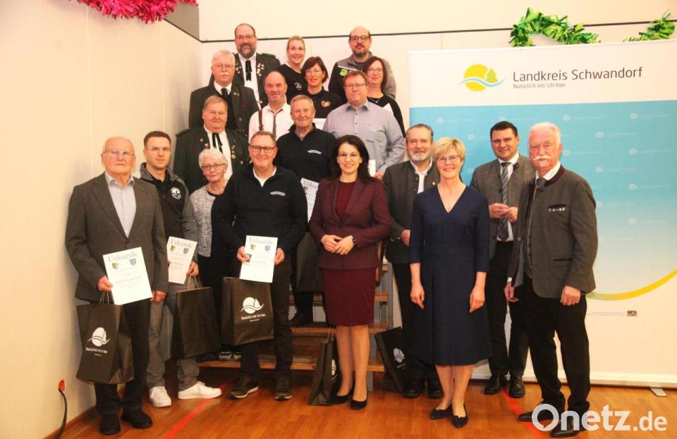Das 15-jährige Funktionärsjubiläum feierten Kerstin Duschl und Claudia Pasurka, beide vom FC Schwarzenfeld, Roman Schneider und Stefan Kupillas, beide von der Schützengesellschaft Auerhahn Steinberg, Anita Messer vom TSV Schwandorf, Ingo Kiendl von der DJK Steinberg und Rudolf Liebl von der SG Eichenlaub Saltendorf. Für zehn Jahre wurden Tina Hadasch, Karin Gsödl und Bettina Shipos, alle vom FC Schwarzenfeld, sowie Michael Nicola vom TSV Schwandorf geehrt.