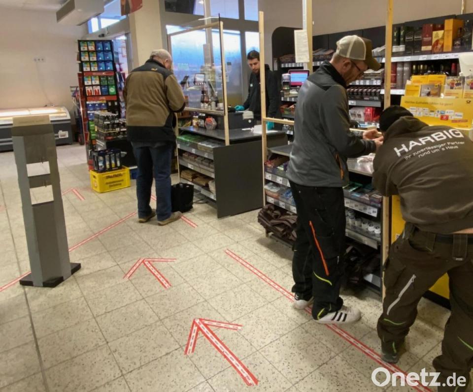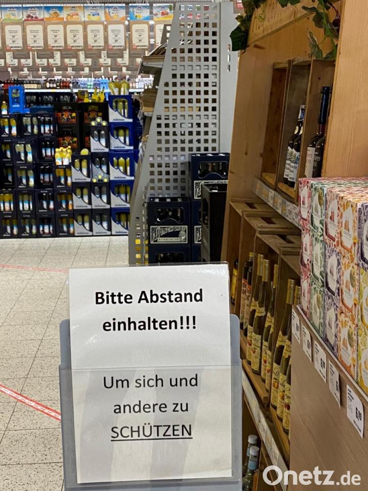 Im Nabburger Rewe-Getränkemarkt werden am Samstagvormittag im Kassenbereich noch zwei Plexiglas-Schutzscheiben montiert. Am Eingang steht ein Schild "Bitte Abstand einhalten" - mit drei Ausrufezeichen, "um sich und andere zu schützen". Damit sich die Kunden in den Gängen zwischen den Getränkekisten nicht zu nah kommen, ist Einbahnverkehr angesagt. Am Boden weisen rote Pfeile den Weg. Auch an der Kasse zeigen Markierungen an, welcher Abstand zum Vordermann gewahrt werden muss.