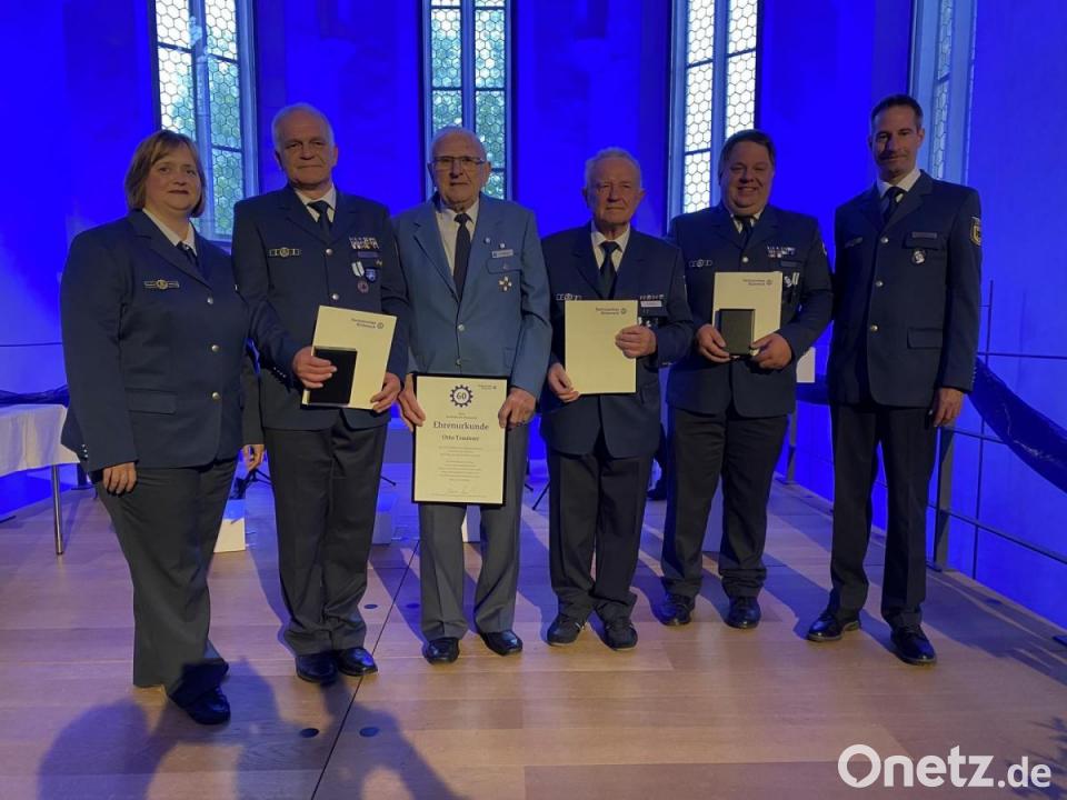 Zu diesem Erfolg trug ein Mann der ersten Stunde maßgeblich bei: Otto Trautner. Verbunden mit hoher Anerkennung und Dankbarkeit würdigte die Bundesanstalt Technisches Hilfswerk dessen "60 Jahre im Dienst der Humanität" nun mit Ehrennadel und -urkunde. Als Vertreter des Landesverbandes hob auch Tilman Gold die zurückliegende, aktuelle wie auch künftige Rolle des THW hervor. Gerne blickte er auf seine Anfangsjahre in der Oberpfalz zurück, verbunden mit den Namen unvergessener Pioniere und in Hochachtung vor der "Power" des Jubiläumsteams. Assistiert von Petra Gärtner als Leiterin der THW-Regionalstelle zeichnete er drei weitere Führungspersönlichkeiten für treue Verdienste aus: Mit dem Ehrenzeichen in Bronze galt sein Dank Friedrich Kristel für dessen seit 1969 unermüdlichen Einsatz in verschiedensten Funktionen. In gleicher Weise honoriert wurden die umfassende Kompetenz von Michael Kleierl als organisationsübergreifendem Berater sowie das grenzüberschreitend geschätzte Engagement von Dietmar Bleistein. Nach Grußworten von Kreisbrandmeister Christian Demleitner und Bürgermeister Frank Zeitler intonierte ein Quartett der Jugendblaskapelle zum Abschluss die Hymnen.