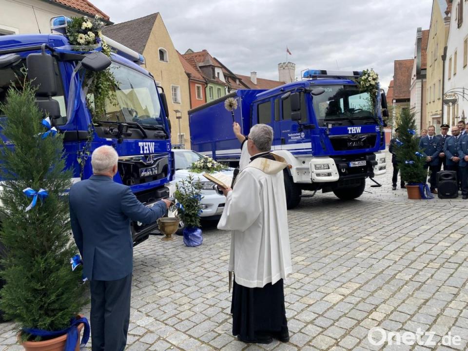 "Kaum, dass uns der Hersteller die Neufahrzeuge bereitgestellt hatte, kam prompt schon ihre erste Einsatzorder", rekapitulierte der Nabburger THW-Ortsbeauftragter Dietmar Bleistein und blickte zur Begrüßung in die Runde der Gäste, Kollegen und Kameraden. "So nehmen wir unser 60-jähriges Jubiläum zum Anlass, für die nun schon erprobten Fahrzeuge rückwirkend den kirchlichen Segen zu erbitten", übergab er das Wort an Pfarrer Hannes Lorenz, der diesen sowohl der Technik wie auch den aktiven Helfern spendete. Beides kommt vorrangig Menschen in akuten Not- oder Katastrophenfällen zugute, eine Sondereinheit ist neuerdings international zudem als "KulturGutRetter" tätig. "Damit auch Nabburgs markantestes Wahrzeichen gut erhalten bleibt", überreichte Dietmar Bleistein seitens des Ortsverbandes eine Spende zur geplanten Sanierung der Kirche an Pfarrer Lorenz, der sich dafür herzlich bedankte.