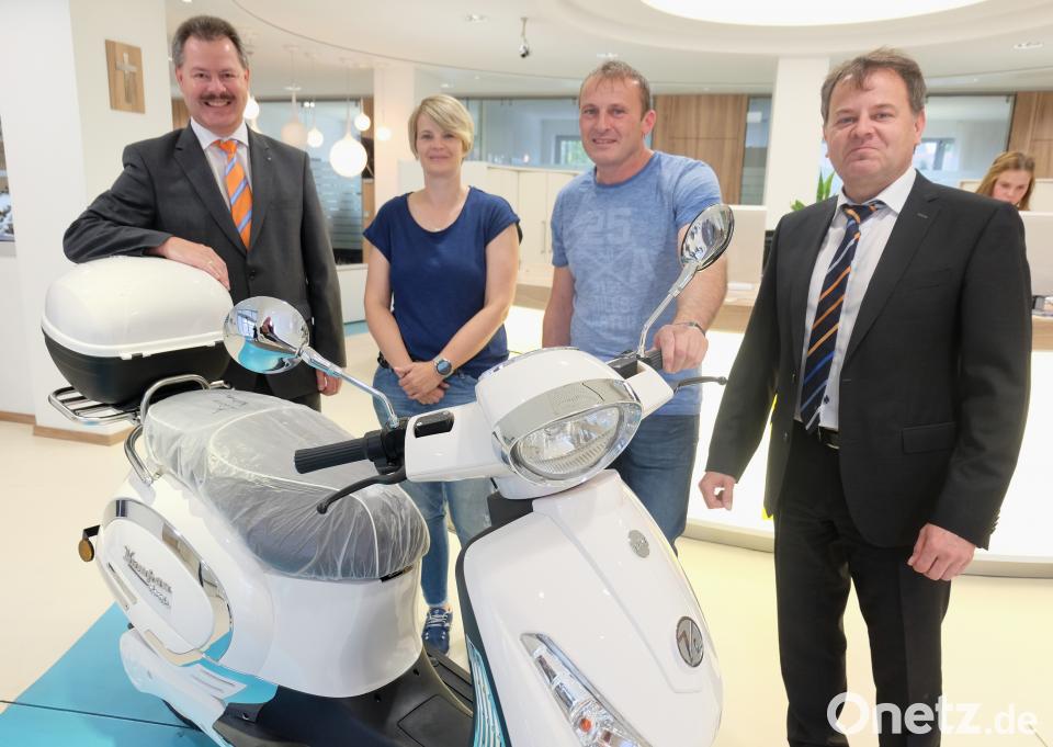 In diesem Jahr schlug Fortuna an der Raiffeisenbank im Naabtal wiederum kräftig zu. Bei der Jubiläums-Mai-Sonderverlosung des VR-Gewinnsparvereines Bayern entfiel auf einen Kunden erneut ein Hauptpreis. Johann Bauer aus Inzendorf (Gemeinde Schmidgaden) kann sich über einen Kumpan electric Roller Modell 1954L mit Topcase, Weißwandreifen und farblich abgestimmtem Helm im Wert von 5000 Euro freuen. Vorstandssprecher Bernhard Werner und Kundenberater Hans Braun übergaben das Fahrzeug und wünschten "Allzeit gute und unfallfreie Fahrt".