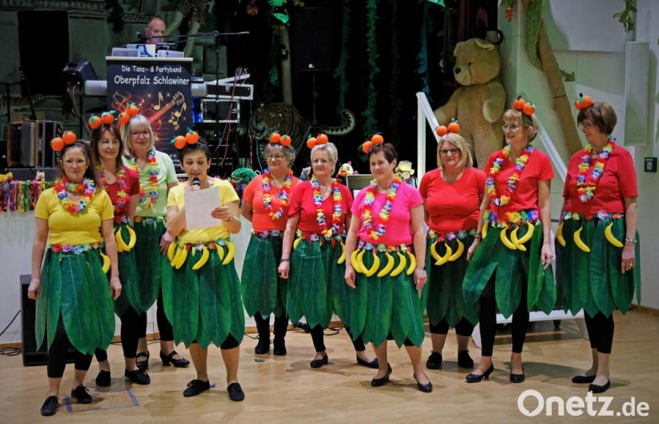 Ausgelassen tanzend zum Motto "Zwei Apfelsinen im Haar und an den Hüften Bananen" eröffnete die Sprecherin des Frauenbunds, Christa Schlagenhaufer, mit ihren Vorstandskolleginnen in entsprechenden Kostümen den Abend. Sie konnten sich freuen: Der sehr schön zum Thema "Dschungel" dekorierte Saal im Jugendwerk war mit über 120 kostümierten Frauen voll besetzt.