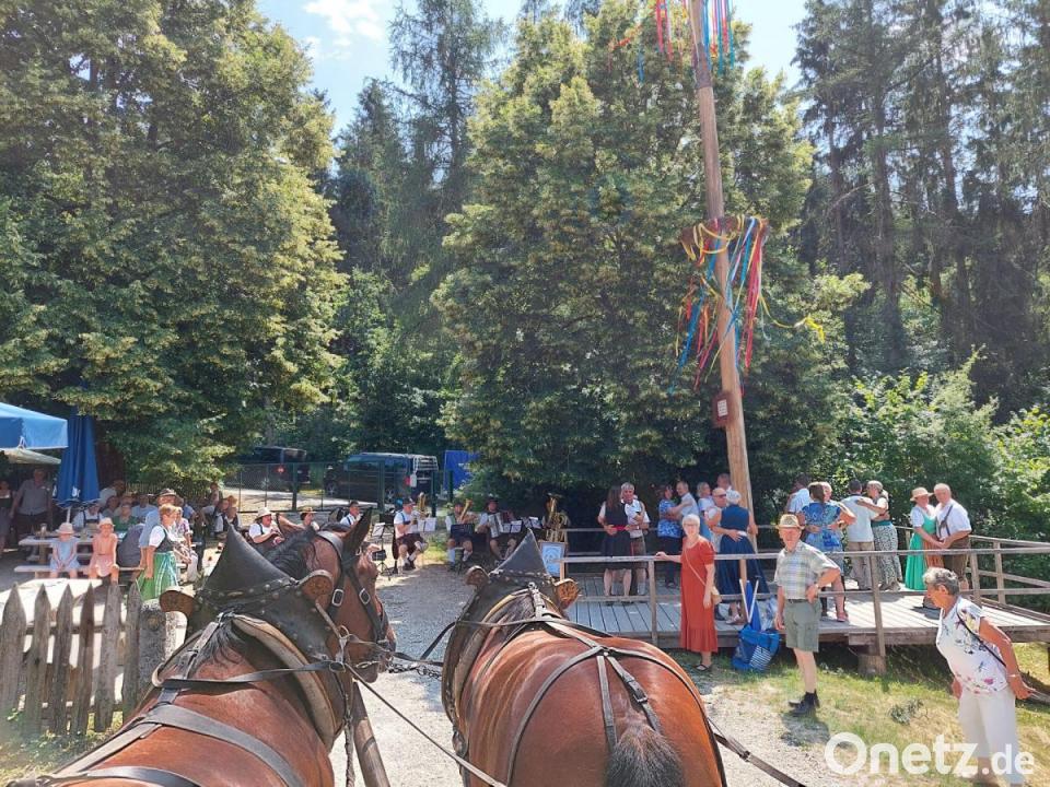 Mitten am Nachmittag wechselten sich dann an allen Stellen die ins Schwitzen geratenen Sänger und Musikanten ab und ließen, wahrscheinlich nicht ungerne, Musikerkollegen den Vortritt. So hatten die Museumsbesucher auch die Chance, Christian und Max Rathey, die „Wadlbeißer“ aus Regensburg, der Männergesang „Brouwadln“, die „Alfelder Musikanten“ und noch viele weitere Volksmusikgruppen zu hören. Das Pferdegespann des Museums mit „Leo“ und „Fonse“ hatte es an diesem heißen Tag auch nicht leicht: Es hatte gut damit zu tun, immer wieder alle Höfe anzufahren und frische Getränke für die Musikanten zu liefern.