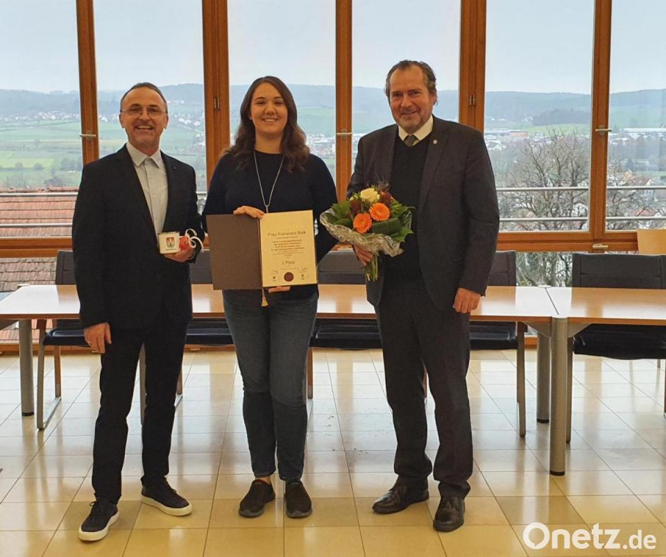 Die junge Zahntechnikerin Franziska Balk, ausgebildet in Nabburg und stammend aus Vilsbiburg, konnte sich nach Lehrzeitverkürzung den Kammersieg (Niederbayern Oberpfalz) in der Gesellenprüfung erarbeiten. Mit der praktischen Traumnote sehr gut nahm sie im Anschluss am Landessiegerentscheid teil, bei welchem sie unlängst in Straubing in feierlichem Rahmen unter hochrangigen Vertretern der Handwerkskammer mit dem ersten Platz ausgezeichnet wurde. Hiermit qualifizierte sie sich zum praktischen Leistungswettbewerb auf Bundesebene, wo sie unter elf Landessiegern den hervorragenden zweiten Platz erzielen konnte. Mit großer Freude über die Leistungen der jungen Zahntechnikerin wurde der Ausbilder und Zahntechnikermeister Rudolf Reil mit Franziska Balk ins Rathaus eingeladen. Bürgermeister Frank Zeitler gratulierte und überbrachte seinen Dank an den Ausbildungsbetrieb, welcher seit 1998 in Nabburg ansässig ist. Im Anschluss überreichte er ein Präsent mit dem Wappen der Stadt.