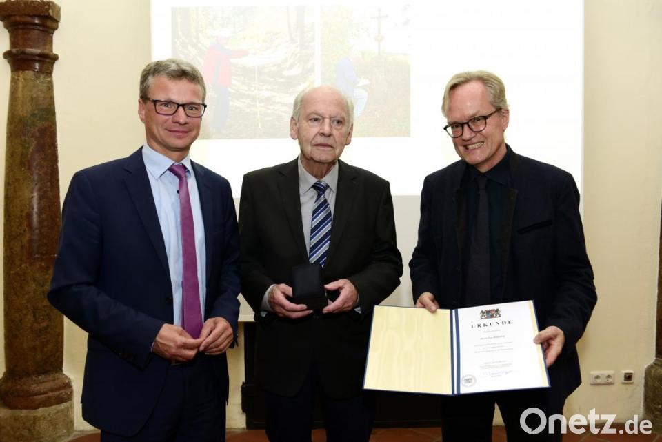 Kunstminister Bernd Sibler (links) und Generalkonservator Mathias Pfeil (rechts) übergaben an Leo Berberich die Denkmalschutzmedaille. Bild: exb/Robert Haas