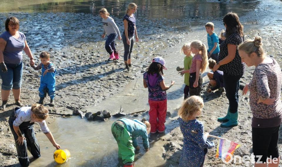 Ausgerüstet mit Kescher, in Gummistiefeln oder komplettem Gummianzug, standen die Kinder bereit. Nach einer Einweisung wateten die "Jungfischer" in den schlammigen Teich, um die restlichen, kleineren Fische - auch unter Mithilfe von Erwachsenen - einzufangen und sie in Bottiche zu bringen.