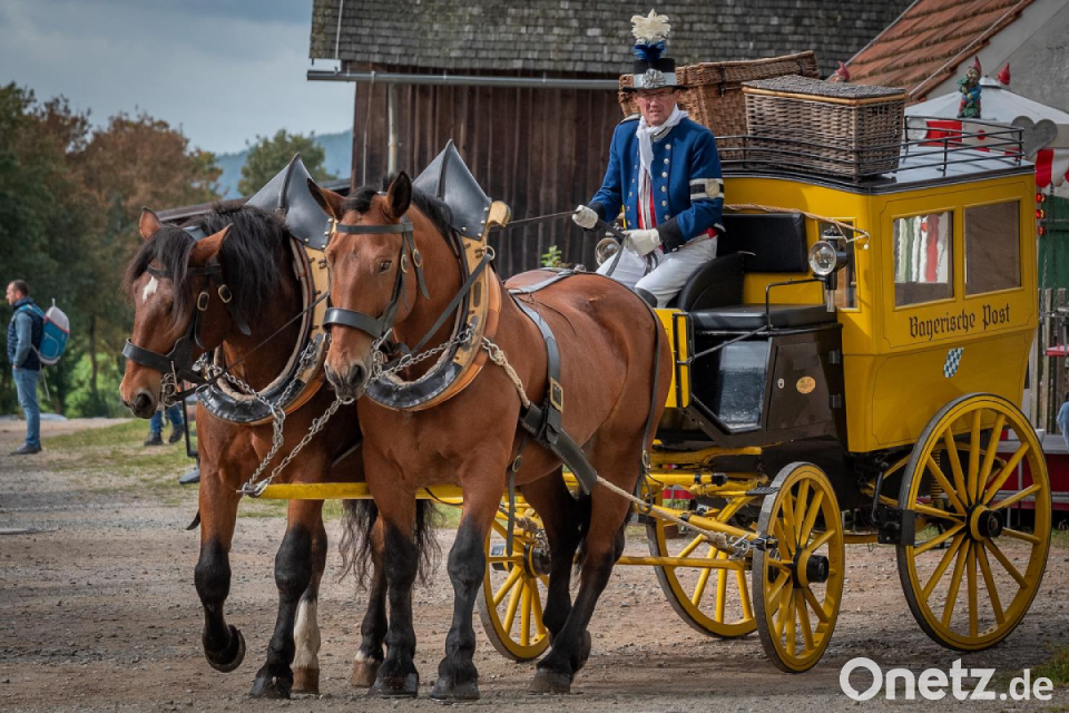 Besonders viel Aufmerksamkeit erregte aber die Postkutsche, die an diesem Tag zum ersten Mal durch das Gelände fuhr. Die Kutsche entstand um das Jahr 1900 und ist ein Neuzugang in der Sammlung. Sie wurde am Kirchweihmarkt stilecht von einem Postillion in voller Montur durch das Museum gelenkt. Das sorgte für Erstaunen und gezückte Fotoapparate bei den Besuchern. „Eine super Sache“, waren sich Besucher und Beteiligte letztendlich einig. Deshalb soll es im nächsten Jahr auch wieder einen Kirchweihmarkt im Freilandmuseum Oberpfalz geben.
