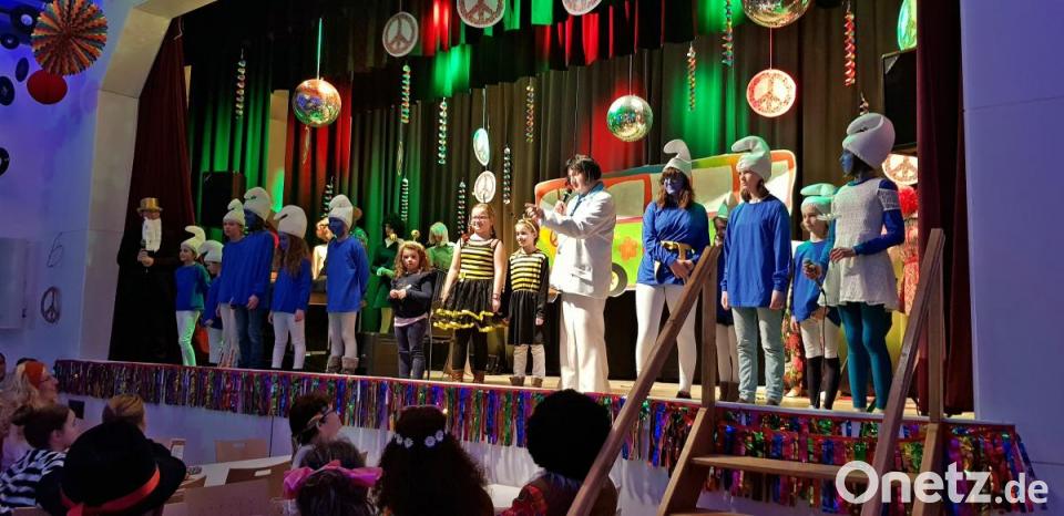 Das große Thema "die 70er Jahre" zog sich durch das bunte Programm des gesamten Abends. Die 70er waren die große Zeit der Schlager und der Hitparade. Darum eröffnete "Dieter Thomas Heck" den Abend mit einer kleinen Auswahl aus der Fülle der Interpreten. Franz Maunz (Harmonika-Franz) spielte eine Runde nach der anderen Schlagermelodien zum Tanzen und Mitsingen. Über Wochen hin auf Platz eins der Hitparade war Vaader Abraham (Jonathan Brell) und die Schlümpfe, ebenso gehörte Roy Black und Anita mit "Schön ist es auf der Welt zu sein" zu dieser Zeit. Und ab 1976 lief im Kinderprogramm "Biene Maja"; darum trugen die Kinderchöre - "Bunte Notenschlüssel" und "Naabspatzen" - diese "Ohrwürmer" gesanglich zum Pfarrfasching bei.