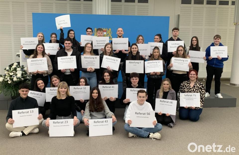 30 angehende Bankkaufleute der Nabburger Berufsschule besuchten gemeinsam mit den Lehrkräften Kerstin Raab und Uli Süßmann das Ministerium für Finanzen und für Heimat in Nürnberg. Nach der Einführung in Struktur und Aufgaben des Ministeriums erfolgte ein Rundgang durch das imposante Gebäude, das im Stadtzentrum Nürnbergs gegenüber der Lorenzkirche liegt. Die Highlights der Hausführung waren die Besichtigung der Büros von Markus Söder und Albert Füracker.
