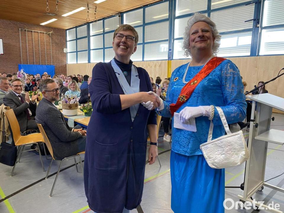 Ihre fortgesetzte Kooperationsbereitschaft dazu versicherten Landrat Thomas Ebeling seitens des Sachaufwandsträgers, zugleich unterstützend Schülersprecher, Elternbeirat sowie der Personalrat mit einem „Osternest“ voller bester Wünsche – und einem Überraschungsgast: „Queen Elisabeth II.“ (Stefan Schropp) gab sich die Ehre. Das legendäre Staatsoberhaupt des Vereinigten Königreichs gestand (natürlich auf Englisch), vieles er- und überlebt zu haben, sei jedoch nie „head of a Bavarian Gymnasium“, also bayerische Gymnasialchefin gewesen. Trotz fehlender Erfahrung in der „challenge to deal with such ghastly institutions like Kultusministerium, Landratsamt or Personalrat“ – also der Herausforderung, mit so schrecklichen Institutionen wie dem Kultusministerium, dem Landratsamt oder dem Personalrat umzugehen", riet sie (auf Englisch) dennoch: „Nehmen wir uns selbst nicht zu wichtig. Niemand von uns hat die Weisheit gepachtet, und wir müssen stets bereit sein, anderen Standpunkten zuzuhören und sie zu respektieren. Das, Anja, war schon immer deine Philosophie, hat dich weit gebracht und wird dich auch weiterhin weit bringen!“
