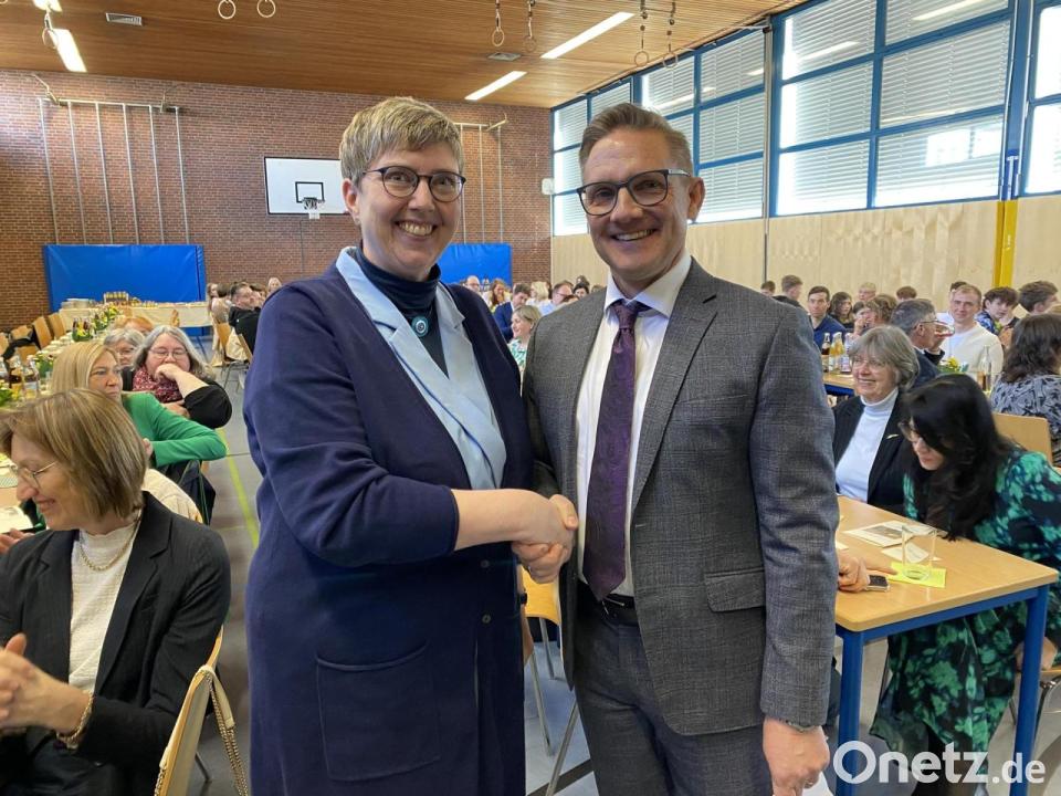 Angesichts der herzlichen Glückwünsche kam die neu ernannte Schulleiterin um Dankesworte nicht umhin, wobei sie sich der künstlerischen Illustrationen des Programmheftes bediente: „Welche davon könnte die passende Message für diesen Anlass vermitteln?“ Ihre Wahl fiel, sinnbildlich für den Schulalltag, schließlich auf das Bild eines lichten Waldes: Aus eigener Erfahrung biete er primär Erholung. Und mit etwas Engagement ließe sich manches Hindernis auf dem Weg hindurch bis zur Lichtung, sprich dem Abitur, bewältigen. „Es ist mir wichtig, den Jugendlichen wieder mehr das Gefühl zu vermitteln, dass sich Anstrengung und Talentförderung lohnen. Mit Einsatzfreude und Unterstützung der Lehrkräfte kann man so auch in weniger naheliegenden Bereichen gut sein“, bekräftigte sie ihre Intention, „als Schulleiterin will ich da als gutes Beispiel vorangehen, der festen Überzeugung: Bildung ist keineswegs immer und überall ein selbstverständliches Privileg!“
