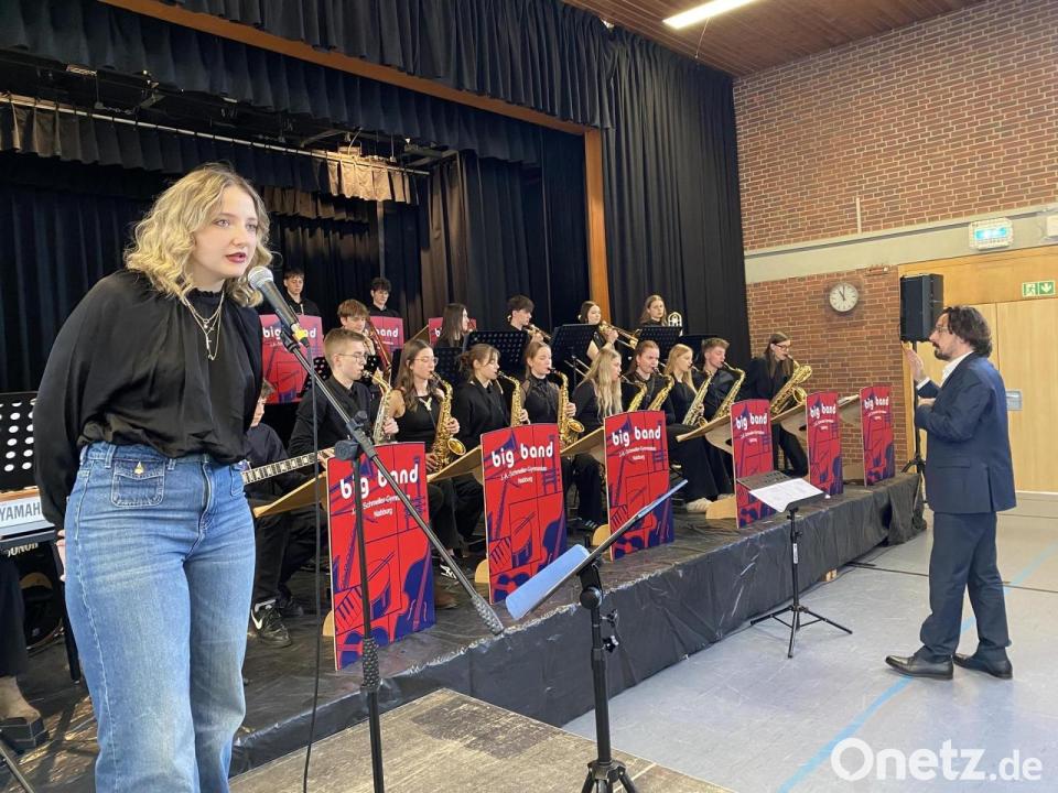 Passend dazu hatte sich das spröde Turnhallenflair wunschgemäß in ein festliches Ambiente verwandelt, um öffentliche und schulische Mandatsträger, aktuelle und ehemalige Kollegen sowie Vertreter der Schülerschaft zu diesem Anlass gebührend zu empfangen. Für klangliche Akzente sorgte die schuleigene Bigband mit Gesangssolistin Ann-Kathrin Kirchner. Die Musiker unter Leitung von Stefan Schindler hatten als Intro die Titelmelodie aus Beverly Hills Cop als perfekte Ergänzung zur Einführungsthematik von Carsten Böckl gewählt: „Das Bild einer guten britischen Serie mit Stil, Tiefgang, Klarheit, feinem Humor und einer Figur, die einen ganz besonderen Eindruck hinterlässt.“ Maßgeblich getragen von der Protagonistin sei nun auch die Position der neuen Schulleiterin des JASG optimal besetzt, quasi „a perfect match!“