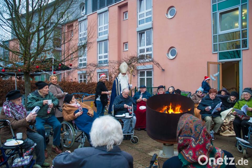 Ums wärmende Feuer sitzend freuten sich die Bewohner des BRK-Seniorenheims über stimmungsvolle Weihnachtsmusik. Jeder Senior bekam vom Nikolaus ein kleines Geschenk: Einen Schoko-Nikolaus und Süßigkeiten. Später wurden die Pflegebedürftigen besucht, die nicht an der Feier im Außenbereich teilnehmen konnten. Zum Aufwärmen gab es Punsch, Feuerzangenbowle und Waffeln, später Gulaschsuppe.