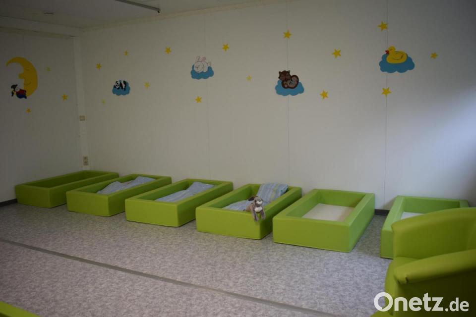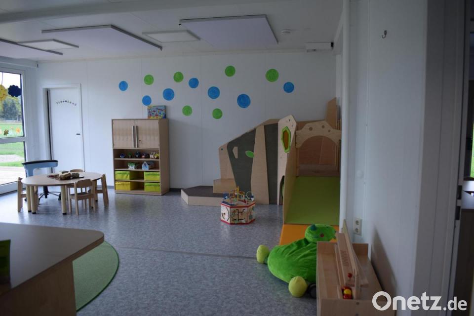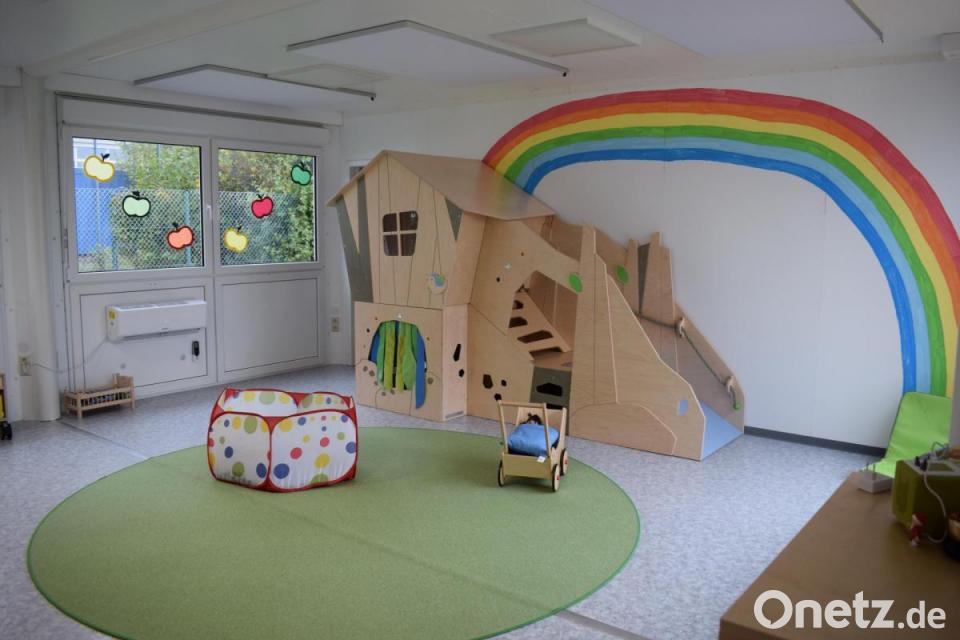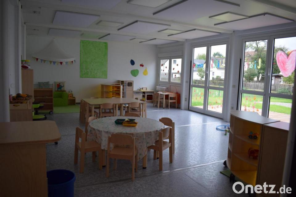 Es bietet Platz für 49 Kinder, die sich in zwei Krippengruppen zu je zwölf Kinder und eine Kindergartengruppe mit 25 Kinder aufteilen. Krippe und Kindergarten sind räumlich getrennt. Dies beginnt bereits bei den Spielplätzen. Die ein- bis dreijährigen Krippenkinder können hinter dem Gebäude spielen, während die älteren Kinder davor ihren Spielplatz haben. Alle Gruppen verfügen über einen eigenen Gruppenraum, Gruppennebenräume und die Krippenkinder über zusätzliche Ruheräume. Dazu kommt noch ein Speiseraum mit Küche und sollte es einmal regnen ein geräumiger Mehrzweckraum.