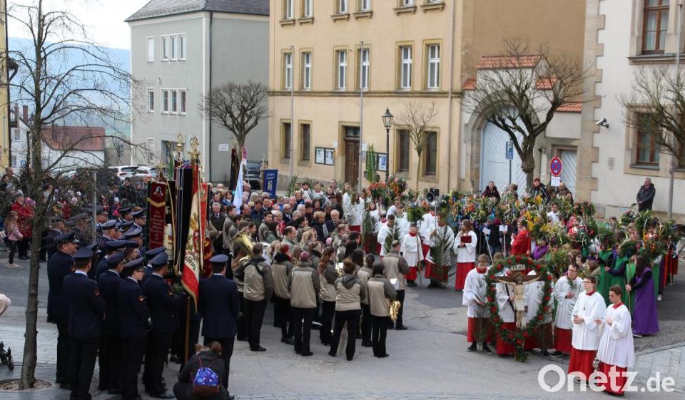 Die Liturgie des Palmsonntags bewegt sich zwischen dem festlichen und fröhlichen "Hosanna, dem Sohne Davids" und dem "Kreuzige ihn", das sich an der anschließenden Leidensgeschichte findet. In dieser Spannung wird deutlich, dass der Palmsonntag als Beginn der Heiligen Woche schon auf den Karfreitag und den Tod Jesu hinweist, aber damit letztlich eben auch auf das Osterfest und die Auferstehung welche jeder Christ erwartet, so Pfarrer Hannes Lorenz. Die Segnung umrahmten die Kindergärten Sankt Angelus und Marien und die Erstkommunionkinder mit Liedern und Fürbitten sowie mit ihren großen in Tischrunden gefertigten Palmbuschen. Mit dabei waren auch die Firmlinge und viele Ministranten. In der Prozession nicht fehlen durften der Stadtrat und die kirchlichen Gremien sowie die Vereine mit ihren Fahnenabordnungen gefolgt von einer großen Anzahl von Gläubigen. Im Gotteshaus trugen die Firmlinge statt des Evangeliums das Passionsspiel vor. Beim Sanctus versammelten sich alle Kinder und Jugendlichen rund um den Altar, ganz nach dem Anspruch der Evangelien, dass es die Kinder von Jerusalem waren, die als Erste Jesus entgegenliefen und ihn begrüßten. Neben den Klängen der Jugendblaskapelle bei der Prozession war es der Kirchenchor, der den Gottesdienst mitgestaltete. Der Frauenbund verkaufte Palmbüschel und Osterkerzen.