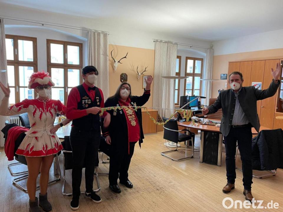 Die Präsidentin der Faschingsgesellschaft Nabburg, Gerlinde Graja, hat am Faschingsdienstag traditionsgemäß das Rathaus gestürmt – natürlich jedoch mit ausreichendem Abstand. Die Gäste im Rathaus – die Präsidentin hatte noch ihre beiden Kinder dabei – hatten ein paar Onlinebotschaften im Gepäck, unter anderem ein Begrüßungsvideo und Gstanzln vom Präsidium. Außerdem überreichte die FG-Präsidentin dem Stadtoberhaupt den diesjährigen Pin der FG und hielt noch eine Büttenrede. Bürgermeister Frank Zeitler freute sich über den Besuch und den Sturm aufs Rathaus. Zum Abschluss gab es noch Krapfen und Sekt.
