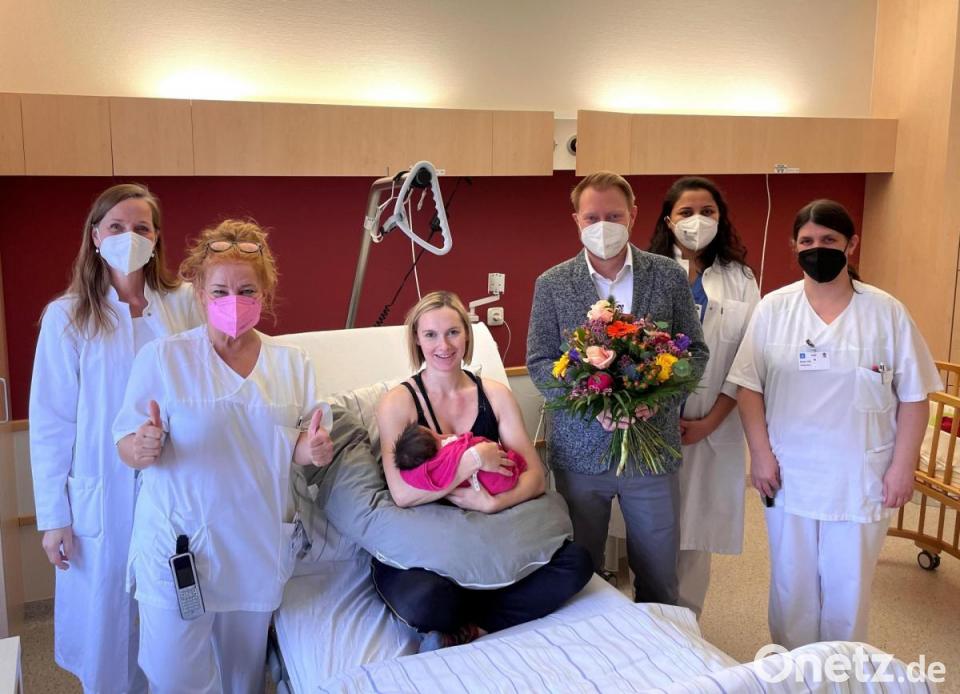 Über den Nachwuchs freut sich mit den Eltern auch das Team der Gynäkologie und Geburtshilfe des Krankenhauses rund um Chefärztin Dr. Susanne Merl. Im Familienzimmer gratulierten der frisch gebackenen Mutter neben Oberärztin Dr. Ursula Stern, Stationsleitung Ute Hilpert, Fachärztin Parizad Aliyeva und Katja Toll vom Pflegedienst auch der Krankenhaus-Geschäftsführer Martin Baumann zum besonderen Baby. Sie alle wünschten der kleinen Apollonia einen guten Start ins Leben. Zur Feier des Tages gab es neben einem Fotoshooting für das Kind einen Blumenstrauß aus der Hand von Geschäftsführer Martin Baumann für die Mutter: "Wir sind sehr stolz und dankbar, dass Sie uns das Vertrauen schenken und hier bereits ihr viertes Baby entbunden haben", wird er in einer Pressemitteilung der Klinik zitiert.