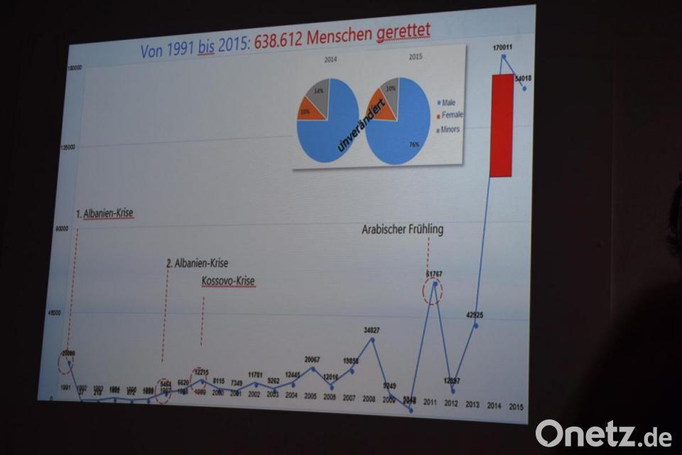 Dass dem nicht so sei, zeigte Michael Buschheuer am Beispiel Libyscher Gefangenenlager, die sogar vom deutschen Außenministerium mit Konzentrationslagern verglichen wurden. Die Menschen hätten keine andere Wahl als zu fliehen, wenn sie ihr Leben retten wollen. In den zwei Jahre, in denen "Sea-Eye" vor der Küste Libyens Ertrinkende aus dem Wasser zog, konnten 13 348 Menschenleben gerettet werden. Dann wurde es für Schiff und Besatzung zu gefährlich, die Rettung weiter fortzusetzen. Aber noch immer ertrinken tausende Menschen auf ihrer gefährlichen Flucht über das Mittelmeer. "Die humanitäre Katastrophe findet jetzt im Verborgenen statt", kritisiert der Referent.