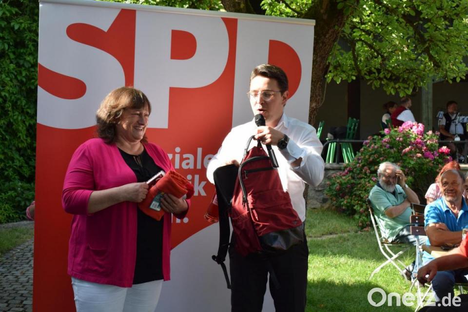 Besonders wichtig ist der Abgeordneten, „dass niemand auf der Strecke bleibt“. Für ihre Rede erhielt Marianne Schieder großen Applaus. Damit sie die Anstrengungen des bevorstehenden Wahlkampfes gut meistern kann, beschenkte sie Peter Wein mit einem roten Rucksack, der viele Stärkungsmittel enthielt.