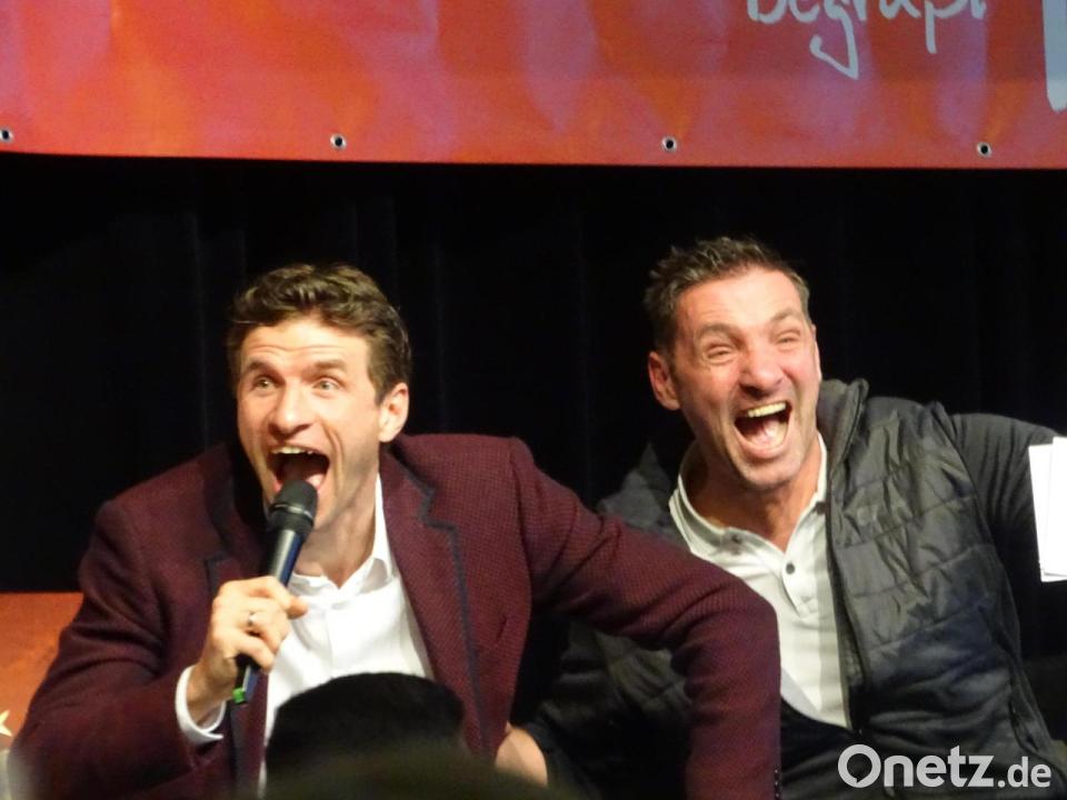 Der zur Unterhaltung vieler Müller-Fans gedachte Wettbewerb verlief amüsant. Zu diesem Zeitpunkt kam der ehemalige Chefreporter von Oberpfalz-Medien ins Spiel. Wolfgang Houschka war mit Sohn und beiden Enkeln in der Stadthalle, drückte mehrfach auf den Auslöser seiner Kamera und sah später am Computer: Da war ein Bild, das ein glücklicher Moment geschaffen hatte. Thomas Müller und Georg Irl saßen dicht nebeneinander und lachten schallend über eine Situation, die sich im Nachhinein vom Anlass her nicht mehr verifizieren ließ.