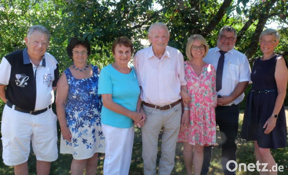 Johann Ploessl (Bildmitte mit Lebensgefährtin Brigitte Laqua und Tochter Elke) feierte seinen 90. Geburtstag. Die Glückwünsche überbrachten auch Bürgermeister Armin Schärtl (Zweiter von rechts) im Namen der Stadt Nabburg, Nachbarin Gudrun Vogt (rechts) sowie Joachim und Monika Otte (von links).