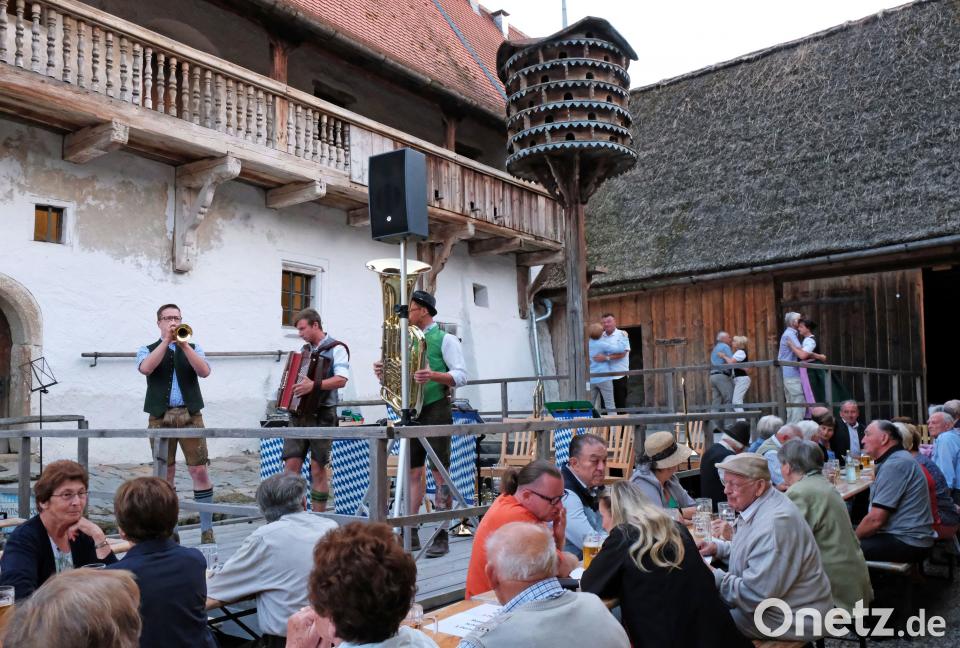 Bei schönem Sommerwetter herrschte eine urige Atmosphäre im Hof des alten Edelmannshofs. Viele Besucher stärkten sich noch mit Bier und einer deftigen Brotzeit. Als dann „Bayrisch Blech“ mit dem „Erzherzog Albrecht Marsch“ begann, sprang gleich der musikalische Funke aufs Publikum über.