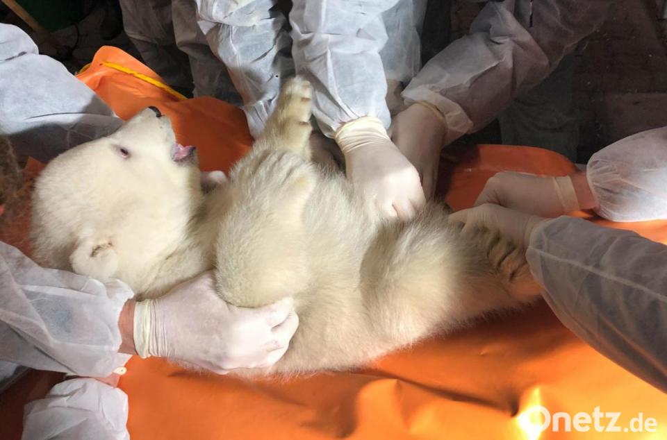 Zwei Eisbärenpfleger und zwei Tierpflegerinnen holten die Jungtiere aus der Anlage. Danach untersuchte der Zootierarzt die kleinen Bärinnen, impfte sie und verabreichte ihnen die erste Wurmkur. Dem Zoo zufolge dauerte die Untersuchung rund zehn Minuten, danach wurden die Schieber wieder geöffnet.