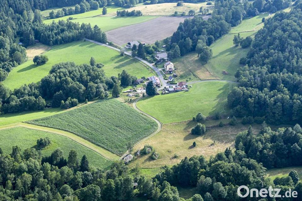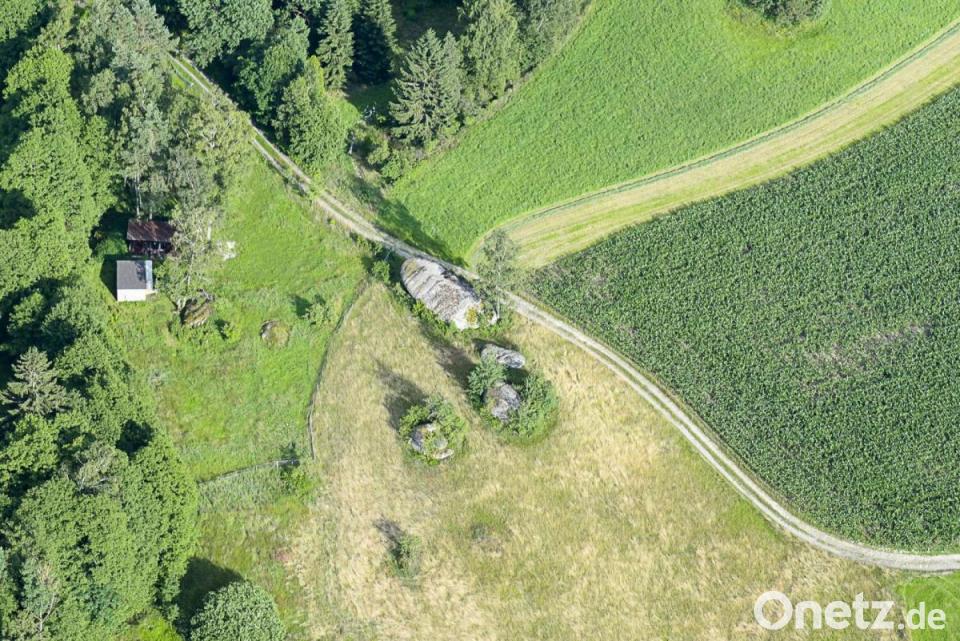 "Es war die Zeit, als einfache Menschen zu Fuß unterwegs waren. Ihr kostbares Paar Lederschuh mussten sie so lange tragen, bis man auf die löchrigen Sohlen keine Schuhsohle mehr aufdoppeln konnte. Eine alte Botengängerin hatte Napfberg im Steinwald gerade verlassen. Sie traf am Dorfrand einen wild aussehenden Mann. Der schleppte schnaufend einen größeren Stein auf der Schulter. Kein normaler Mann macht das händisch! Sie - über Geister wohl erfahren - ahnte Böses: Sein grüner Hut, sein stechender Blick. Als der Fremde sie dazu noch brummelig fragte, wann er wohl endlich zur neuen Wallfahrtskirche Fuchsmühl komme, wo er hin müsse! Da meinte die schlaue Alte: Ich geh auch dorthin. Ach weit, weit ist’s dorthin! So weit! Schauen's, hab' den einen Schuh schon durchgelaufen! Der unheimliche Fremde, leid aller Mühe, verlor die Beherrschung. Er warf den Stein weit von sich, der im Flug immer größer wurde. Als Monsterfels landete er unterhalb von Napfberg am Acker der großen 'Ausnahmswiesen' von Haus Nr 2. Unter Donner und Blitz löste er, der 'Grünhütl', sich auf. Er hinterließ einen schillernden Haufen, der fürchterlich nach Schwefel und Knoblauch stank, das 'Asantum' (Teufelsdreck)."