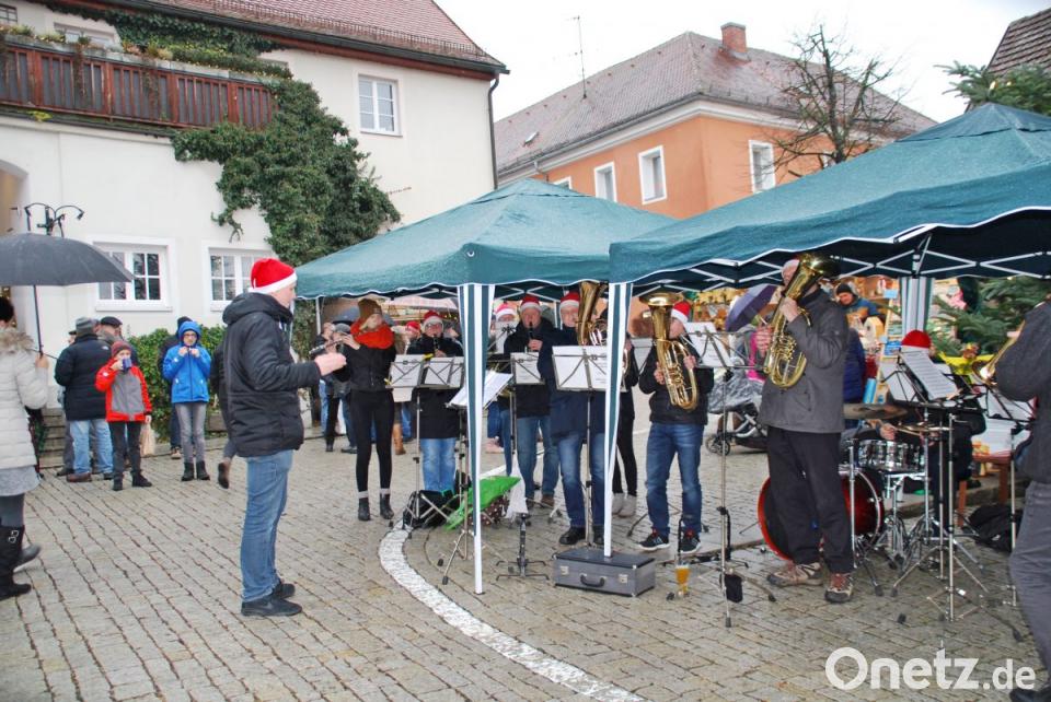 Am Nachmittag spielte die Blaskapelle Ernestgrün beim Christbaum weihnachtliche Klänge. Um Regenschauer abzuwehren, wurden schnell zwei klappbare Zelte aufgestellt. Zum ersten Mal gab bei der Vorstellung - neben dem musikalischen Leiter Klaus Rustler - auch Michael Frank den Takt schwungvoll an. Für Nachwuchs wird hier auf allen Ebenen gesorgt. Der Drehorgelspieler wanderte mit seinen Weihnachtsliedern von Ort zu Ort und untermalte damit die Stimmung, die auch der immer wieder einsetzende Regen nicht trübte. Nur der Rauschgoldengel stand durchnässt am Ende des Tages traurig im Dunkeln in der Judengasse und wartete auf einen Fön, der ihm das lockige Haar trocknete.