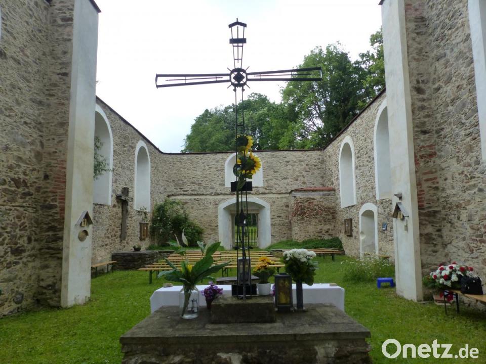Fast hundert Besucher hatten kurz nach dem Glockengruß Platz genommen, den Eingangschoral des Bläserquartetts des Musikvereins Ernestgrün gehört und den Zelebranten, Pfarrer George Parankimalil aus Neualbenreuth, erwartet. Der Bürgermeister der Patengemeinde Neualbenreuth, Klaus Meyer, hieß alle willkommen und gedachte der Verstorbenen aus den Heimatorten der Vertriebenen. Dazu legte er einen mit weiß-roten Blumen und Schleifen geschmückten Kranz an der Stelle nieder, wo einst die Kanzel hing. Walther Maier verlas das "Vermächtnis der Maiersgrüner und Grafengrüner", in dem an geschehenes Unrecht erinnert, aber auch zu Frieden und Eintracht gemahnt wird.