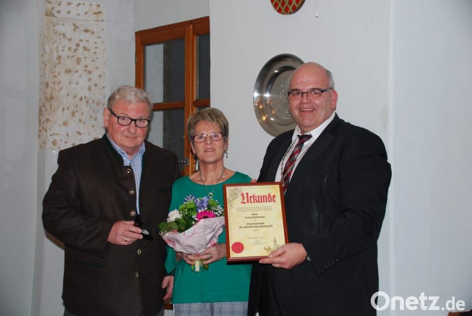 „Im September 2008 wurdest du in der Septembersitzung zum Seniorenbeauftragten berufen. Mein Vorgänger, Altbürgermeister Albert Köstler, und das gesamte Gremium waren sich einig darüber, dass es keine bessere Wahl für dieses Amt geben würde“, so Klaus Meyer weiter. Danhauser habe mit unermüdlichem und charmantem Wirken Herzen und Seelen der Senioren erobert. Sämtliche Veranstaltungen – ob informativ oder gesellig – sowie die tollen Ausflüge seien immer in kürzester Zeit ausgebucht gewesen. Immer an seiner Seite habe seine Frau Evi ihn in ihrer liebevollen Art unterstützt. „Hinter jedem starken Mann steht ja bekanntlich eine noch stärkere Frau“, so Meyer und überreichte Evi Danhauser zum Dank einen Blumenstrauß und an Franz Danhauser die Ehrenmedaille mit Urkunde.