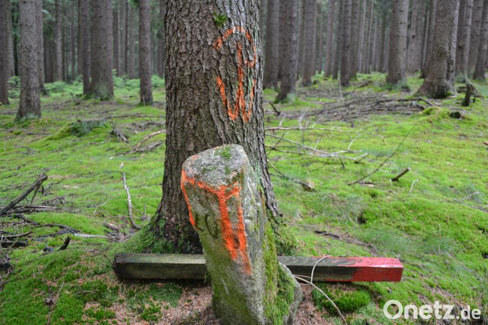 An einem Baumstumpf bleiben die Wanderer stehen. Dort stand einst eine Rainbuche von großer Bedeutung. Als Solitärbaum im Fichtelwald markierte die Buche, heute der Stumpf, die Grenze zwischen Waldsassen und Eger und die Gerichtsgrenze der Fraisch. So bezeichnete man laut Egerer Landseuterbuch von 1395 die Gegend um Neualbenreuth.